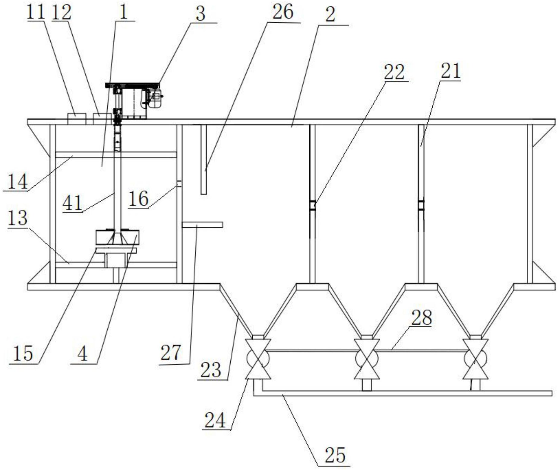 本实用新型公开了一种稀土草酸沉淀回收装置的萃取槽,包括:萃取槽体、下料槽体、搅拌电机、搅拌器,下料槽体连接在萃取槽体的侧部,萃取槽体设置有出液口,出液口连通下料槽体;萃取槽体在顶部设置有有机进料口、稀土料液进口、第一搅拌轴孔,搅拌电机固定在萃取槽体的顶部;搅拌轴上部穿过第一搅拌轴孔连接搅拌电机的转轴,搅拌轴下部连接搅拌器;下料槽体在内部纵向设置有多个分隔板,分隔板将下料槽体内部分隔成多个澄清室,分隔板设置有物料流通口,物料流通口的高度低于出液口的高度;澄清室的底部设置有下料漏斗,下料漏斗底端设置有出料阀,出料阀的出口连接有输送总管道。本实用新型简化了操作工序,提高了稀土草酸沉淀回收的效率。