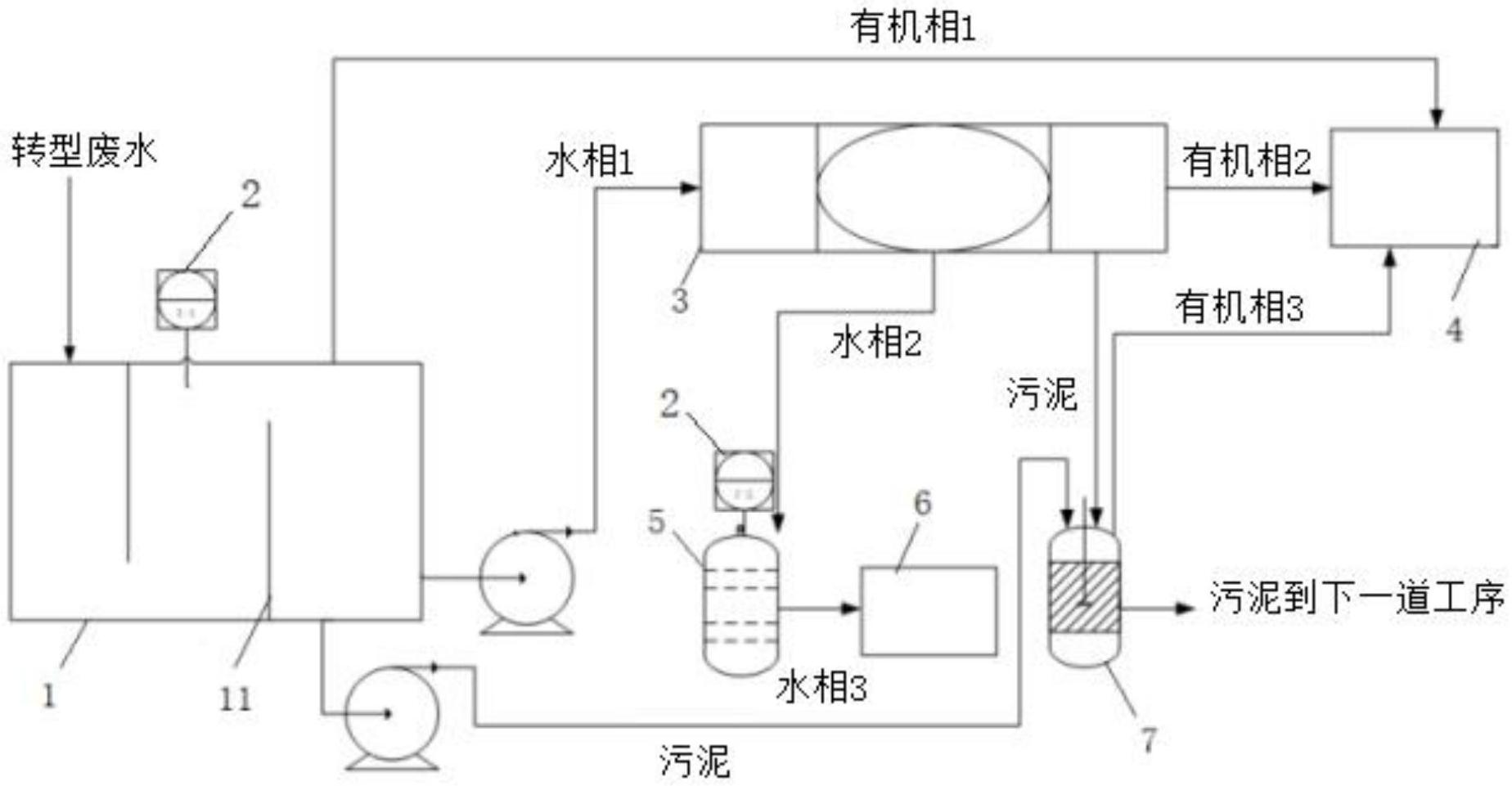 本实用新型公开了一种稀土转型废水中有机回收的装备,包括:调节池、气浮设备、浮油收集池、过滤器、清水池、污泥浓缩罐;调节池上部通过有机相管路连接浮油收集池,下部通过水相管路连接气浮设备;气浮设备的下部通过水相管路连接过滤器,过滤器通过水相管路连接清水池,上部通过有机相管路连接浮油收集池;调节池、气浮设备的底部分别通过排污管路连接污泥浓缩罐,泥浓缩罐的上部通过有机相管路连接浮油收集池。本实用新型在不投加任何药剂的前提下,实现废水中有机的高效回收,水中的油含量≤10mg/L,降低了有机单耗,做到废水中油、渣和水的分离。