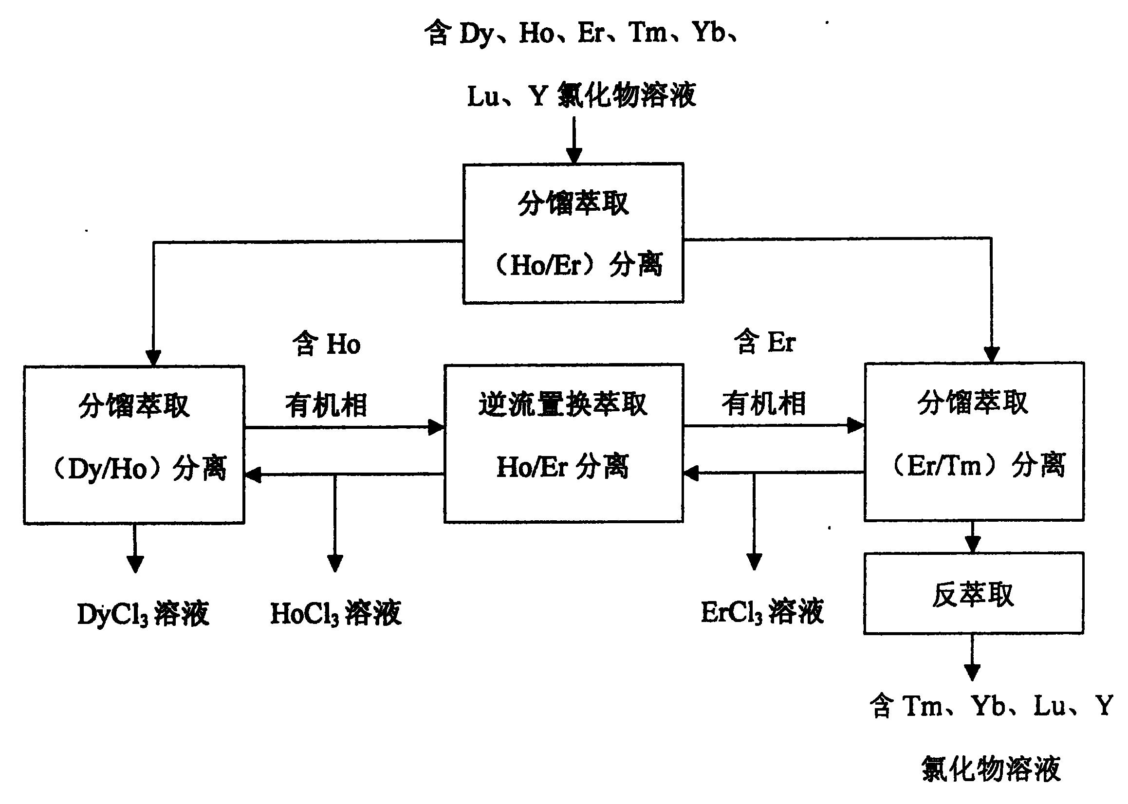 本发明属于稀土冶炼领域,特别是萃取分离混合稀土生产高纯单一稀土的方法。其特点是:将含Ce有机相和部分含PrCl<SUB>3</SUB>的溶液进行逆流置换萃取,逆流置换萃取时,将上述两种溶液同时进入萃取装置进行混合、澄清,参数为20-50级、有机相比水相之比为5-10倍,得到含Ce Cl<SUB>3</SUB>溶液E和含Pr的有机相,将上述溶液沉淀、过滤、灼烧,得到≥99.9%~99.995%的La<SUB>2</SUB>O<SUB>3</SUB>、CeO<SUB>2</SUB>、Pr<SUB>6</SUB>O<SUB>11</SUB>、Nd<SUB>2</SUB>O<SUB>3</SUB>、高纯产品和含Sm、Eu、Gd、Tb、Dy、Ho、Er、Tm、Yb、Lu、Y中重稀土富集物。本发明分馏萃取与逆流置换萃取的结合,实现分离相邻稀土元素的酸碱消耗为零,使整个工艺的酸碱消耗降低37%,大大降低了生产成本。提高产品质量。且工艺简单、操作方便、产品质量稳定,适合工业规模生产,可以进一步推广。