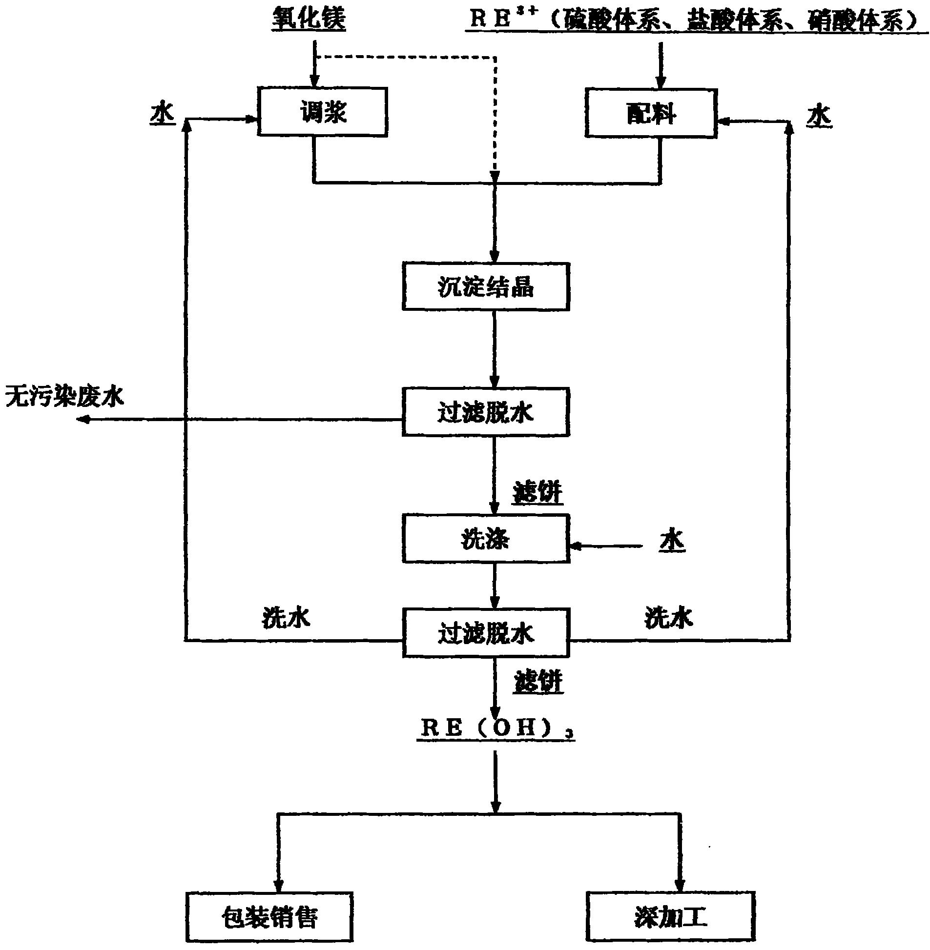 本发明是采用氧化镁作为一种沉淀剂,用于稀土溶液的沉淀生产工艺,属于稀土制备领域。本发明在调浆槽中加水并加温,在水中加入氧化镁,进行调浆配置;在配料槽中加入稀土料液,并加入适量的水,将配好的稀土料液加温;将配好的氧化镁料浆及配好的稀土料液等当量加入沉淀反应槽,进行沉淀反应;将沉淀好的料浆打入过渡罐并进行过滤脱水,产出滤饼。过滤好的滤饼加水调浆后,再进行洗涤并过滤脱水,脱水后的固体产品即为氢氧化稀土,洗水回收再利用。本发明氧化镁沉淀稀土生产工艺克服了传统稀土沉淀工艺的不足,大幅度降低了生产成本;解决了废水处理的难题;扩大了沉淀剂的应用范围;有利于稀土工业的清洁生产。