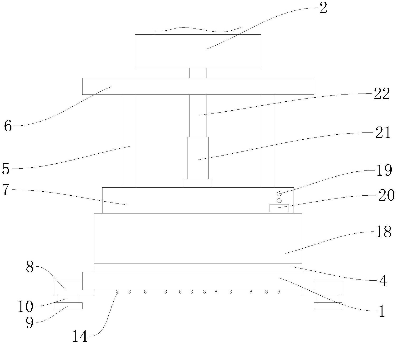 本实用新型公开了一种铝合金衣架成型机用模具,包括底座和成型机冲压头,底座上壁面固定安装有缓冲垫,且缓冲垫上固定有下模具,下模具内固定有冷却管,冷却管能导流冷却液,底座上固定有若干贯穿缓冲垫与下模具的立柱,立柱上端固定连接顶板,立柱滑动连接上模具,上模具上设有转动的螺纹筒,且成型机冲压头上设有与螺纹套配合的螺纹杆。与现有技术相比,本实用新型的优点在于通过螺纹调节冲压头和上模具实际距离,改变上模具与下模具间的距离,生产不同厚度规格的产品;冷却管内置,实现快速降温,提高生产效率。
