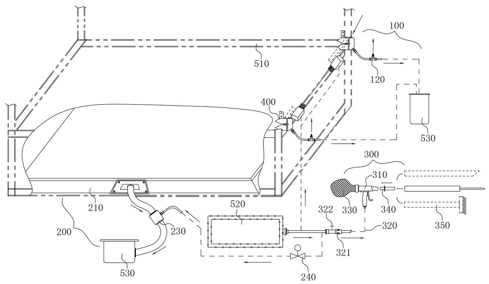 本发明属于喷气织机技术领域。一种喷气织机的集尘系统和方法,包括上部集尘组件、下部集尘组件和集尘箱,上部集尘组件包括设置在折边器上的排气孔和连通设置在排气孔上的排气管道,靠近排气孔的排气管道上连通设置有稳压组件;下部集尘组件包括设置在喷气织机下部的集尘壳体、连接设置在集尘壳体上的集尘吸管和负压抽吸单元。本发明能够节约能源、节约备件、保证了职工健康、提高了车间环境、除尘效果良好,从根本上解决了喷气织机生产时产生棉尘造成的安全隐患,减少了清洁机台和维修机台的频率和停车时间,提高了产量和质量,同时延长了备件使用周期,提高了设备性能和产品的质量。