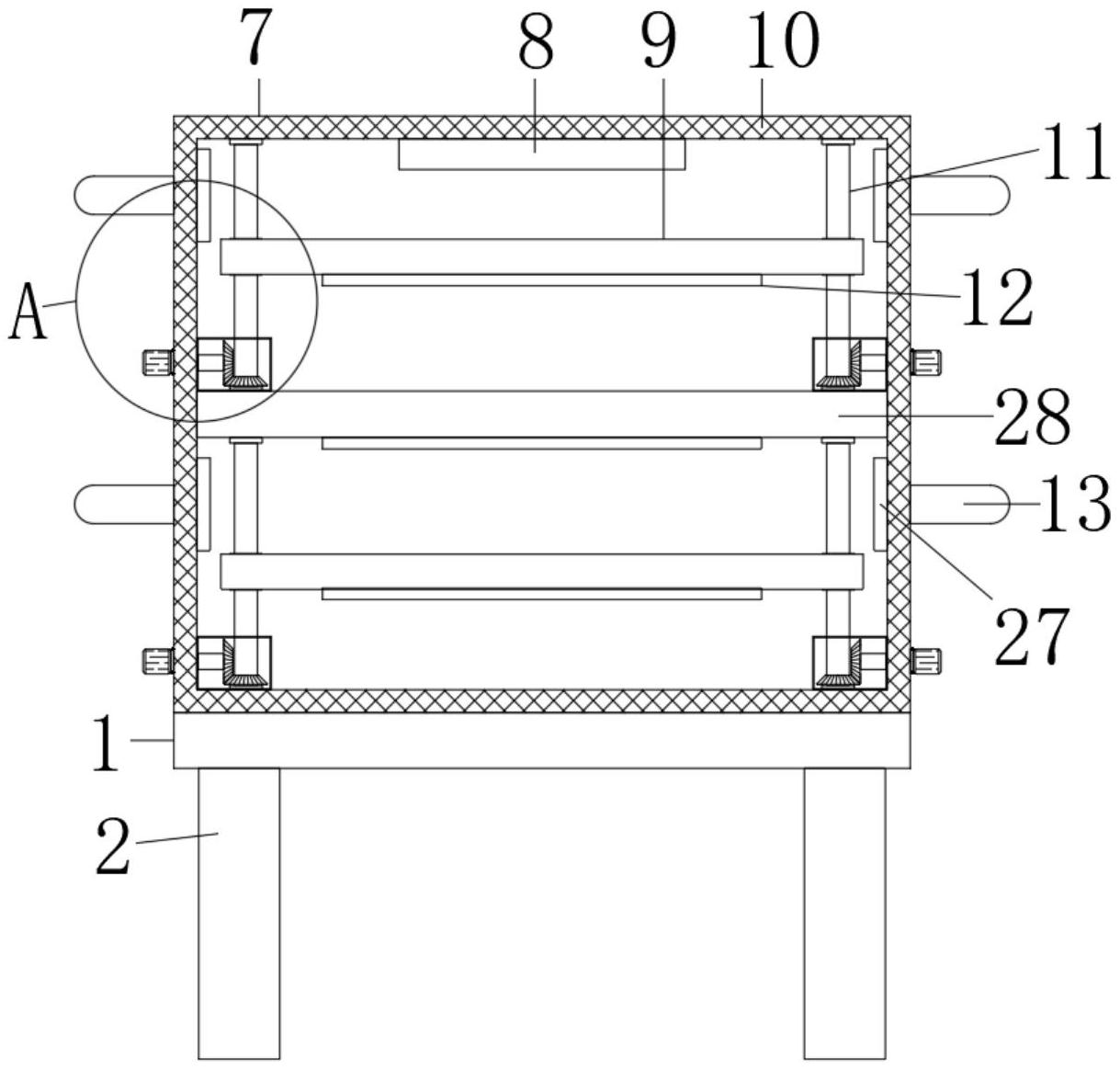 本实用新型公开了一种蜂王幼虫制品活性成分的保鲜装置,包括底座,所述底座的上端固定连接有保鲜箱,所述保鲜箱的中部固定连接有挡板,所述挡板的上端对称设置有螺纹杆,所述保鲜箱的侧壁对称设置有若干个驱动电机,所述驱动电机的输出端固定连接有转轴,所述转轴的一端固定连接有第一锥齿轮,所述螺纹杆的外部套接有保护壳,所述螺纹杆的外部固定连接有第二锥齿轮,所述螺纹杆的外部螺纹连接有连接件,本实用新型涉及蜂王幼虫制品保鲜技术领域;该王幼虫制品活性成分的保鲜装置,通过向保鲜箱的内部输送氮气对王幼虫制品进行保鲜,以及利用螺纹杆带动置物架进行移动,方便放置蜂王幼虫制品,从而进行保鲜。