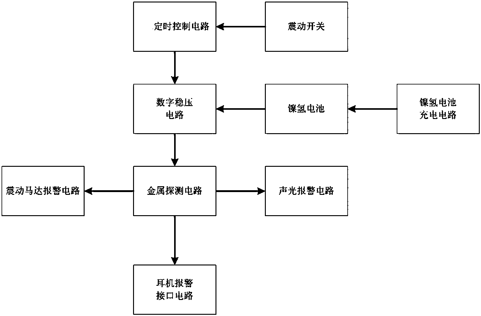 本实用新型所涉及一种新型高端手持金属探测器,包括金属探测电路,分别与金属探测电路连接的耳机报警接口电路,震动马达报警电路,声光报警电路,数字稳压电路,镍氢电池与数字稳压电路连接,镍氢电池充电电路与镍氢电池连接,定时控制电路与数字稳压电路连接,震动开关与定时控制电路连接。使用时,所述金属探测器利用LC谐振原理产生振荡的正弦信号,利用互感原理实现金属的探测,信号处理使用高速的运放,能快速、准确地处理信号,有较好的探测灵敏度。定时控制电路实现定时自动休眠功能,当没有进行操作时开始计时,计时时间到了自动关断电源,同时增加了震动开关对金属探测器的移动进行检测,从而达到快速,简约,使用方便,操作方便功效。