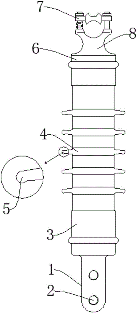 本实用新型公开了复合绝缘横担线路柱式绝缘子,包括下侧连接端、外壳和伞裙,所述下侧连接端上侧设置有所述外壳,所述外壳外侧设置有所述伞裙,所述伞裙下侧设置有延长伞,所述下侧连接端内侧设置有螺栓孔。有益效果在于:本实用新型通过设置的延长伞,使得雨雪可以直接从延长伞滴下,不会沿着伞裙向底部回流,进而避免闪络现象的发生,通过设置的端座、上端盖、弹簧、一号螺栓、一号螺母、二号螺栓、二号螺母、电线槽和螺栓槽,使得导线的固定步骤简化,提高固定效率。