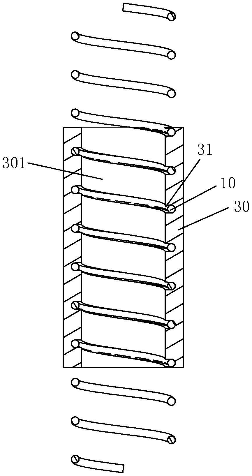 本实用新型提供一种金刚石串珠和金刚石绳锯,金刚石串珠包括金刚石基体和螺旋线圈,所述金刚石基体具有一通孔,所述螺旋线圈与金刚石基体共轴设置并嵌设于金刚石基体内,且所述螺旋线圈凹陷于金刚石基体的内壁面,进而使金刚石基体的内壁面在螺旋线圈位置形成螺牙沟。极大的提升了与金刚石基体的结合牢固性,运用至金刚石绳锯上时,突破了现有技术中的瓶颈;金刚石串珠在轴向方向上的防窜动和在周向旋转方向的防旋转能力得到质的提升。