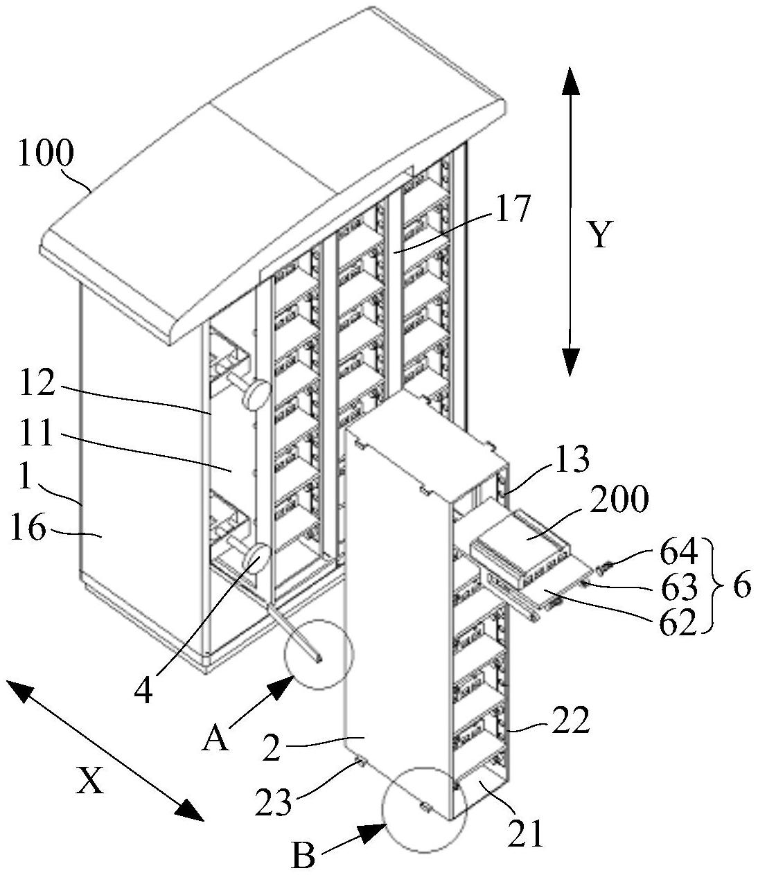 本申请公开了一种机柜,涉及通信工程技术领域,用于解决机柜内部的通信设备维修不方便的问题。该机柜包括柜体以及放置件。柜体的内部形成安装腔,开设有与安装腔连通的安装口。放置件设置于安装腔内,内部形成放置腔,开设有与放置腔连通的放置口。沿第一方向,放置件与柜体滑动连接。其中,第一方向与安装口所在的平面相交。该机柜用于放置通信设备。