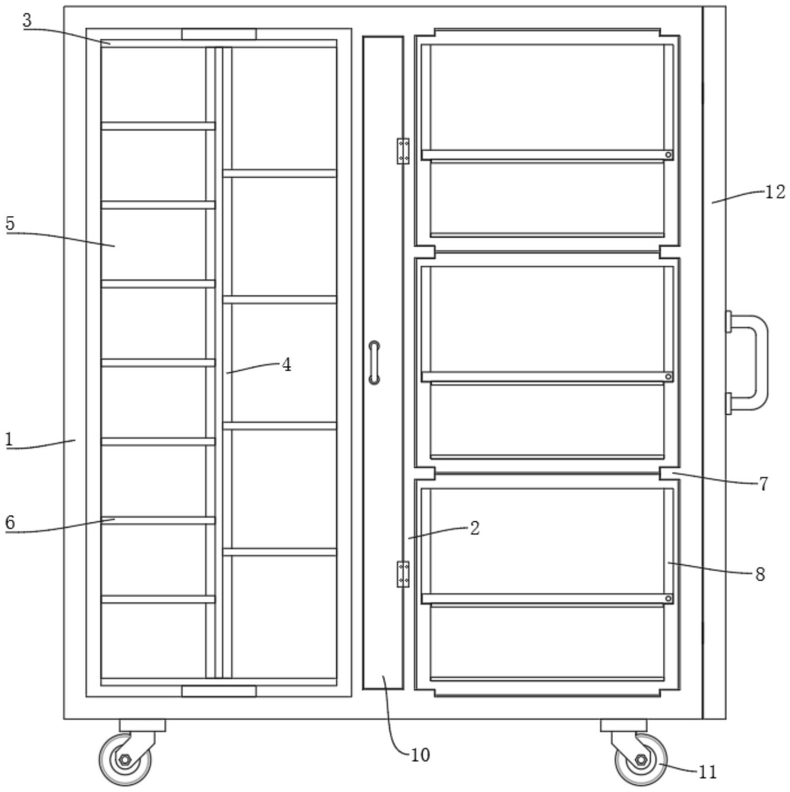 本实用新型涉及石墨模具技术领域,尤其是一种适用于石墨模具存放的储存装置,包括壳体,所述壳体一侧通过合页铰接有门体,所述壳体内部固定安装有隔板,所述壳体内部并位于所述隔板一侧转动连接有固定板,所述固定板内部固定安装有连接轴,所述连接轴外侧固定安装有侧板,所述侧板之间固定安装有支板,所述壳体内部并位于所述隔板另一侧设置有存放件,该储存装置防潮效果好,能够防止模具之间粘结,值得推广。