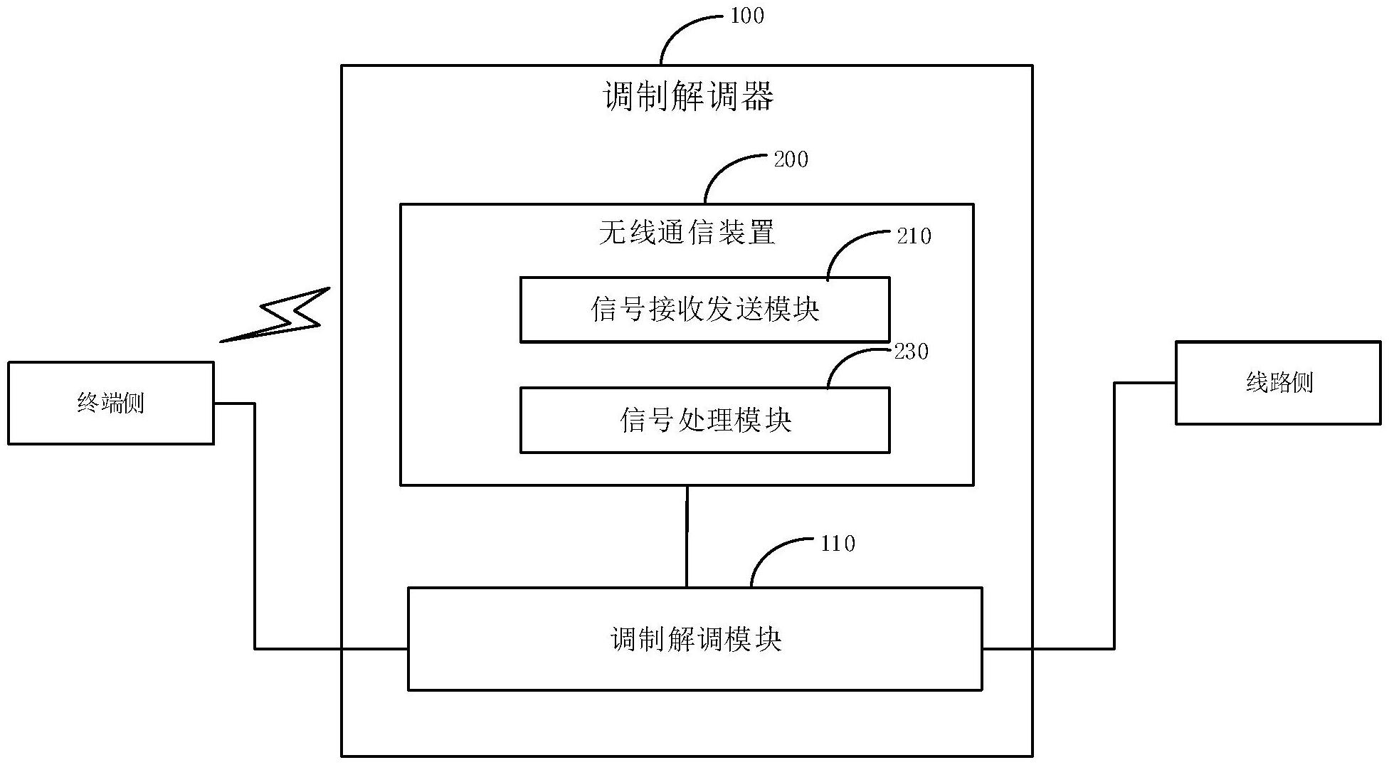 本申请提供一种无线通信装置及调制解调器,所述无线通信装置设置在调制解调器内,所述调制解调器包括调制解调模块,所述无线通信装置包括:相互连接的信号接收发送模块和信号处理模块;所述信号接收发送模块一端与终端侧设备无线通信连接,所述信号处理模块一端与所述调制解调模块连接;所述信号接收发送模块用于无线信号的发射和接收,并对接收到的无线信号进行降噪和滤波处理,将处理后的无线信号发送至信号处理模块;所述信号处理模块用于对处理后的无线信号进行数据信号处理,并将无线信号转换成电信号或将从调制解调模块处接收的电信号转换成无线信号。本申请提供的无线通信装置提高了信号传输性能。