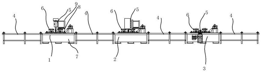 本实用新型公开一种中梁钢异型槽加工生产系统,包括一级加工工序装置、二级加工工序装置和三级加工工序装置,一级加工工序装置通过从动支撑输送辊道与二级加工工序装置相连接,二级加工工序装置通过从动支撑输送辊道与三级加工工序装置相连接,一级加工工序装置、二级加工工序装置和三级加工工序装置均包括铣削动力机构和设于铣削动力机构侧端的定位输送限位机构,本实用新型实现对中梁钢相对刀具的铣削线性运动,有效避免加工时由于误差造成中梁钢的上下窜动而造成加工误差,有效避免中梁钢窜动从而损坏刀具,保证加工整体的精度,有效保证产品整体加工的质量;能够对中梁钢进行三重加工,使得加工后中梁钢最终成型,加工精度高,成型效果好。