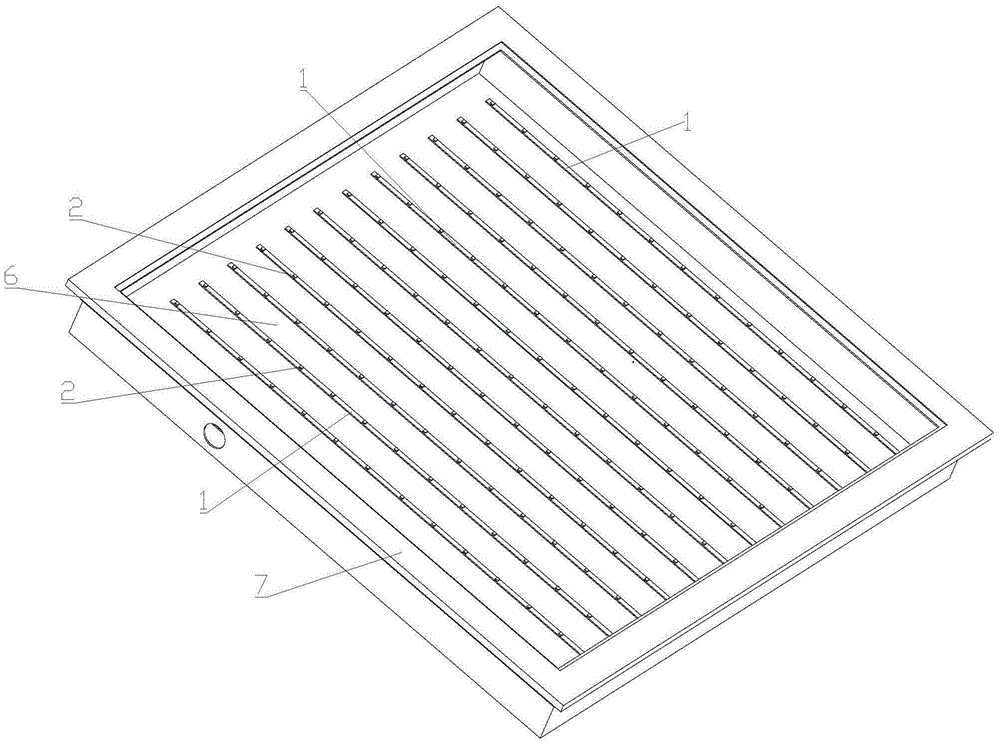 本实用新型公开了一种LED灯,包括:散热底座和灯,其中,散热底座的一表面上覆盖设置第一绝缘层,第一绝缘层上设置导电层,导电层上覆盖设置第二绝缘层,灯设置于第二绝缘层上且与导电层电连接。本实用新型设置散热底座,既可以起到底座的作用,又可以起到散热的作用;第一绝缘层和第二绝缘层分别起到绝缘的作用;导电层是导电的作用;本实用新型的结构设计实现了LED灯直射的目的,同时,结构简单,减少了部件,简化了生产;还有灯可以均匀分布,使得灯光均匀照射。