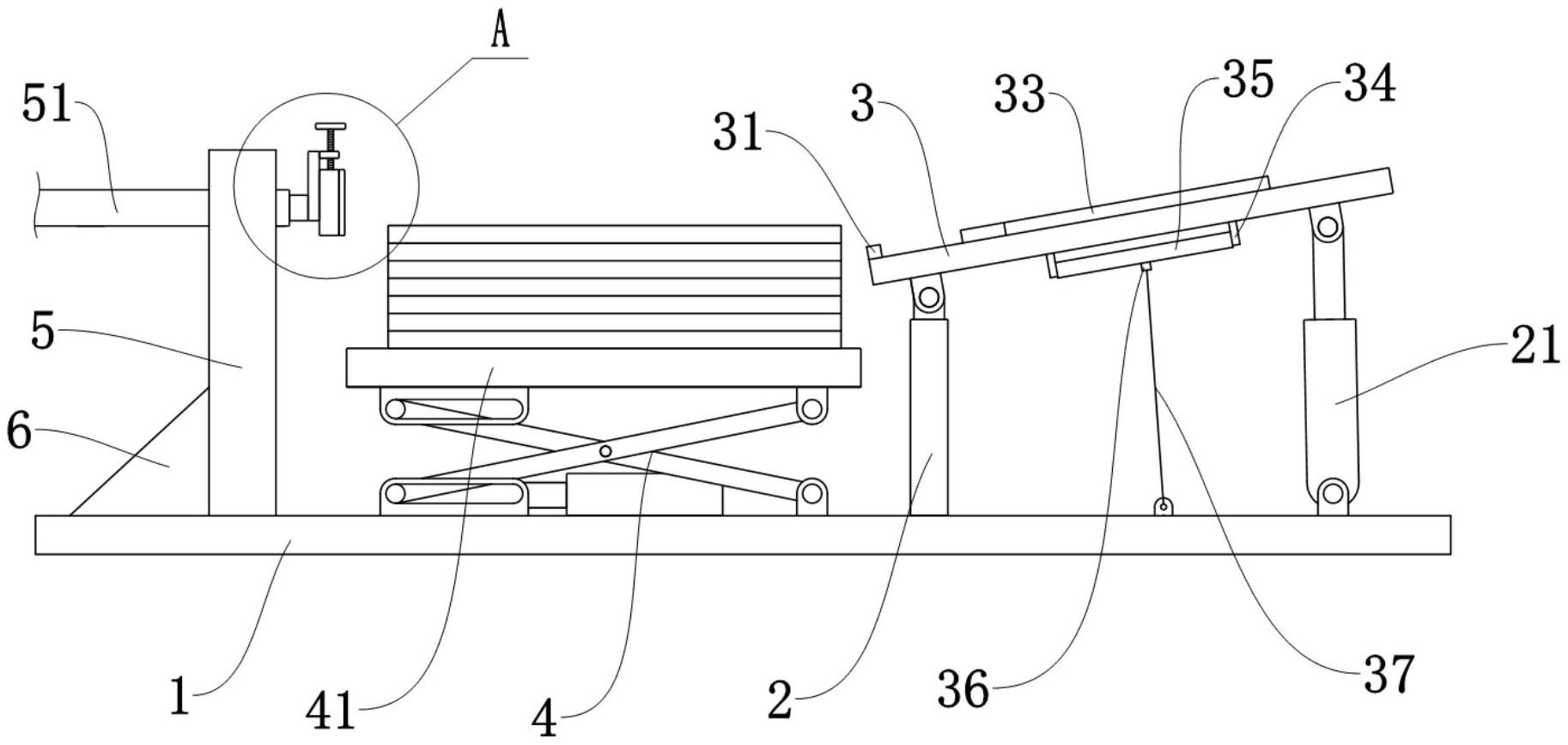 本实用新型公开了用于木门面板裁切的自动输送定位装置,包括底板,所述底板上表面固接有一对支撑柱,一对所述支撑柱上端共同铰接有工作台,所述底板上表面且位于一对所述支撑柱一侧铰接有第一气缸,所述第一气缸伸缩端与所述工作台另一侧下表面相铰接,所述工作台内开设有一对安装口,一对所述安装口内插装有一对侧挡块,所述工作台下表面设有侧挡块推动装置,所述底板上表面且位于一对所述支撑柱一侧安装有剪式伸缩架,所述剪式伸缩架上安装有放置板。本实用新型的优点在于通过第一气缸可以使工作台倾斜,通过木门板的自重会与后挡块贴紧,实现了横向限位,通过一对侧挡块可以将木门板侧向限位。