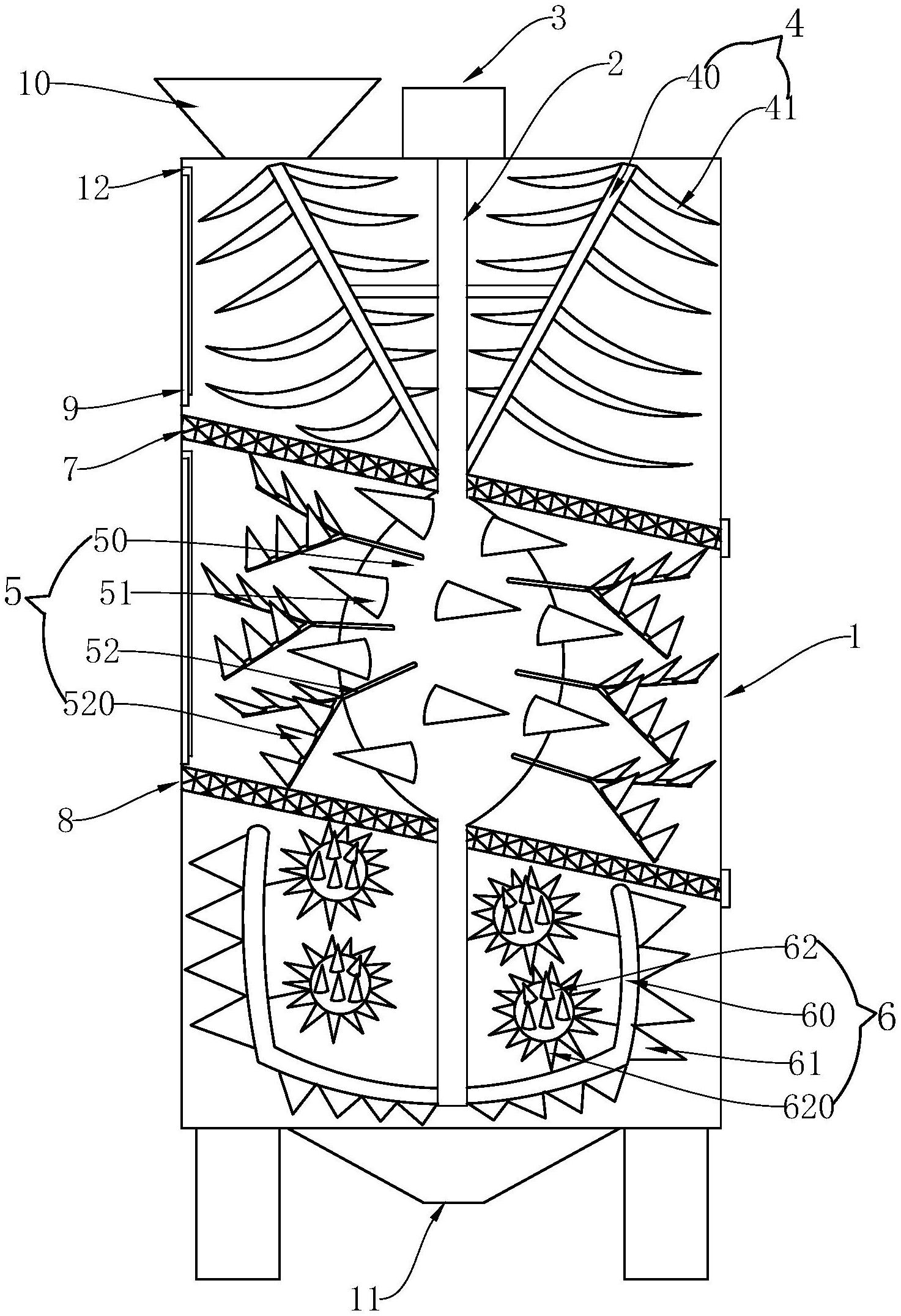 本实用新型涉及薄膜生产技术领域,尤其涉及一种青贮膜生产时边料回收用粉碎装置,包括本体,本体的顶部设有进料口,本体的底部设有出料口,本体的内部设有搅拌轴,搅拌轴的穿过本体的一端连有电机,位于本体内部的搅拌轴上设有第一粉碎部件、第二粉碎部件和第三粉碎部件,第一粉碎部件包括设置在搅拌轴上部的搅拌杆,搅拌杆上设有多个第一切刀;第二粉碎部件包括设置在搅拌轴上的粉碎辊,粉碎辊的外壁上设有多个第二切刀;第三粉碎部件为设置在搅拌轴上搅拌框,搅拌框的边框上设有多个第三切刀。利用该粉碎装置,大大提高了粉碎效率,缩短粉碎时间。