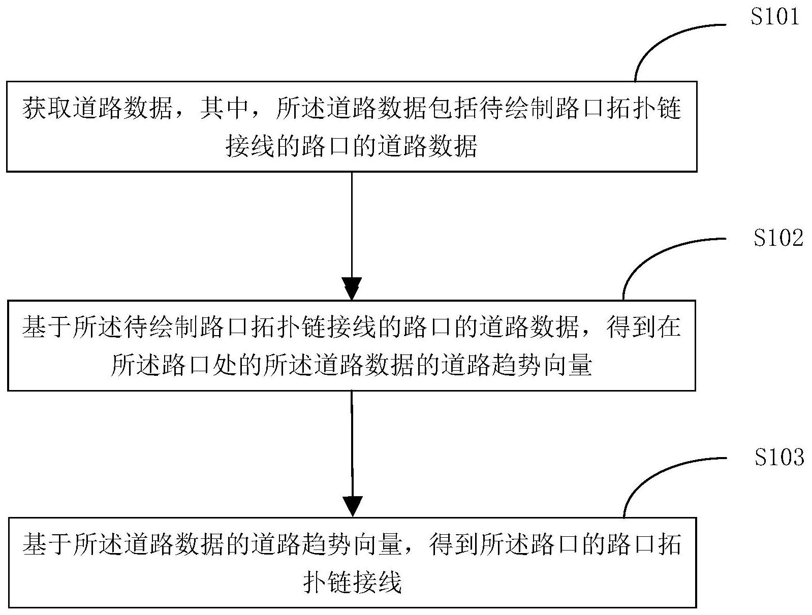 本发明实施例公开了一种路口拓扑链接线的绘制方法及系统,涉及计算机技术领域。其中方法包括:获取道路数据,其中,所述道路数据包括待绘制路口拓扑链接线的路口的道路数据;基于所述待绘制路口拓扑链接线的路口的道路数据,得到在所述路口处的所述道路数据的道路趋势向量;以及基于所述道路数据的道路趋势向量,得到所述路口的路口拓扑链接线。根据本发明实施例的路口拓扑链接线的绘制方法,依据已知的有限的道路数据拓扑属性,以自动化的方式绘制路口拓扑链接线,降低了工作人员绘制路口的工作强度,同时提高了路口绘制的生产效率。
