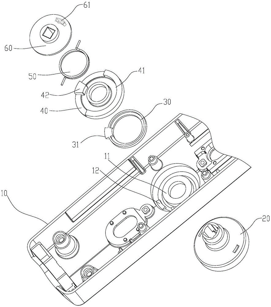 本实用新型涉及一种锁用把手复位机构,包括面板,面板上设有设有中空转轴,中空转轴径向方向的侧部设有第一挡块;还包括设于面板一侧的把手、依次设于面板另一侧且套设在中空转轴上的转板、扭簧固定座、扭簧和把手固定座;把手穿过中空转轴与把手固定座相连接;扭簧安装于扭簧固定座上;把手旋转带动把手固定座、扭簧固定座、转板在中空转轴上转动至与第一挡块抵接,之后继续转动开门,开门后扭簧回弹带动把手反转复位。通过面板与把手固定座、扭簧固定座和转板的组合,实现把手大于360角度开门,并在把手开门后,在扭簧的作用下自动反转一定的角度,使锁芯的斜舌更容易在自身的弹力下更容易弹出,结构更可靠。