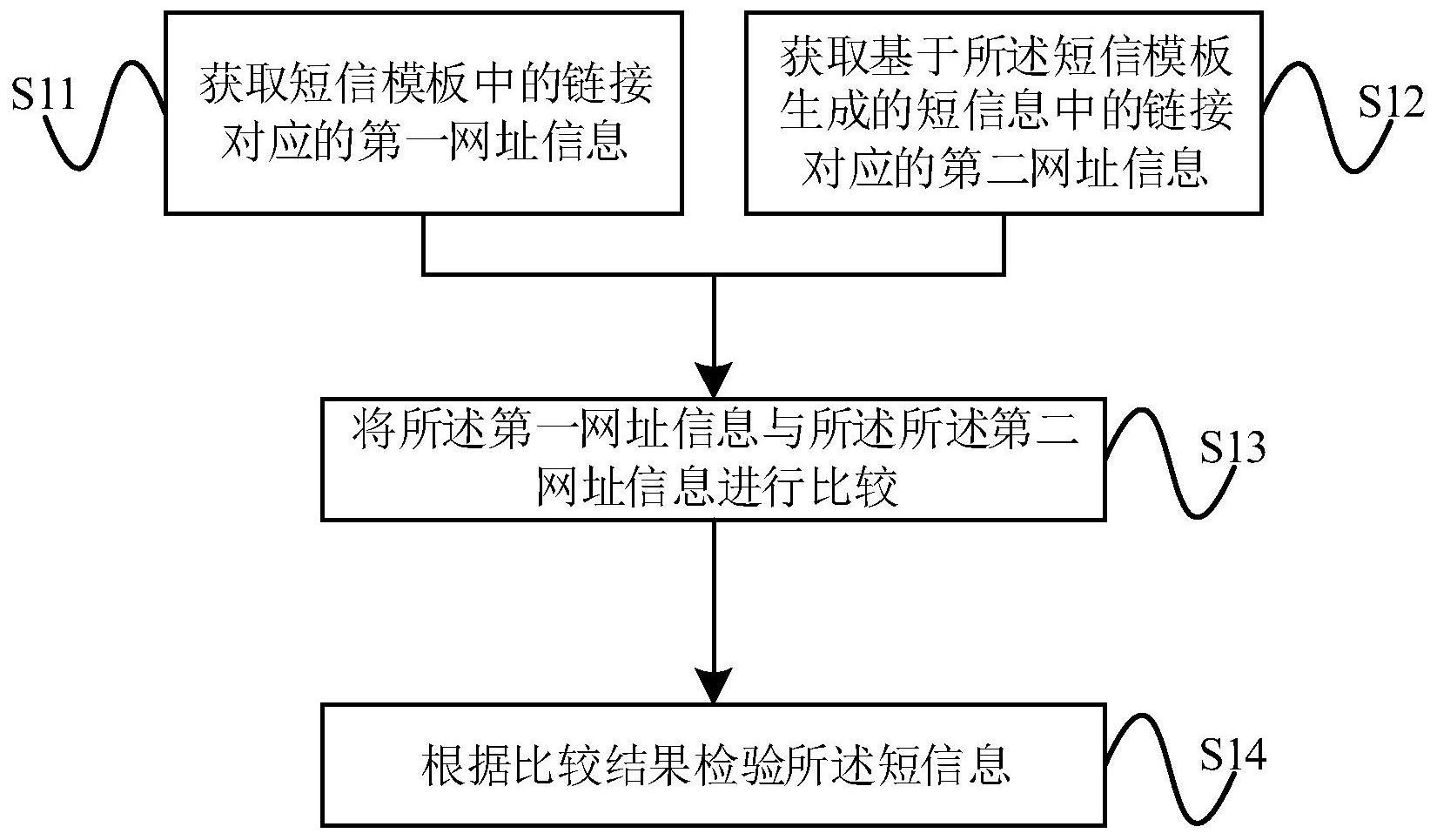 本发明公开一种短信息检验方法、装置和系统。该方法包括:通过获取短信模板中的链接对应的第一网址信息和获取基于该短信模板生成的短信息中的链接对应的第二网址信息,并将第一网址信息和第二网址信息进行比较,通过比较结果检验短信息。若检验结果是短信息中的链接对应的网址信息发生了改变,则可以进行短信息发送拦截,或者对短信息中的链接对应的网址信息进行再次审核检验。从而有效避免了通过短信息中的链接对应的网址信息发送不合规、不合法等内容,避免了现有技术中直接发送而未再次比对的弊端与漏洞,也可以有效地检验出短信息中的恶意链接等。