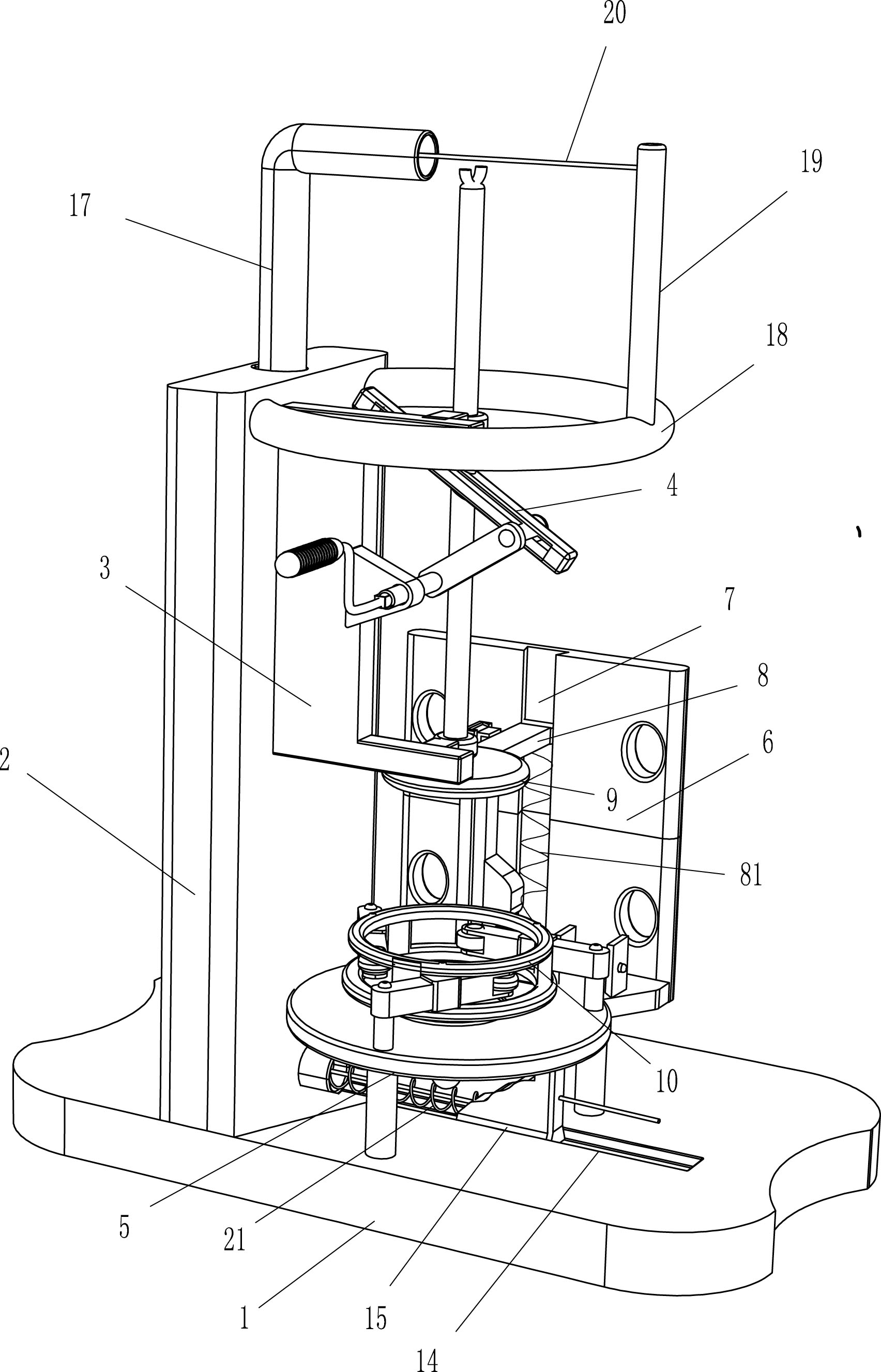 本发明属于童车生产技术领域,尤其涉及一种童车车筐下压设备。本发明的技术问题为如何提供一种结构新颖、便于操作,下压力度均匀的童车车筐下压设备。一种童车车筐下压设备,包括有底座、安装板、N形架、升降装置、圆座、固定板、滑块、第一弹性件等;底座顶部设置有安装板,安装板上设置有N形架,底座顶部设置有圆座,圆座与安装板相邻的侧壁设置有固定板,固定板靠近圆座侧壁开有滑槽,滑槽上滑动式设置有滑块,滑槽底部与滑块之间设置有第一弹性件。本装置结构简单,便于操作。