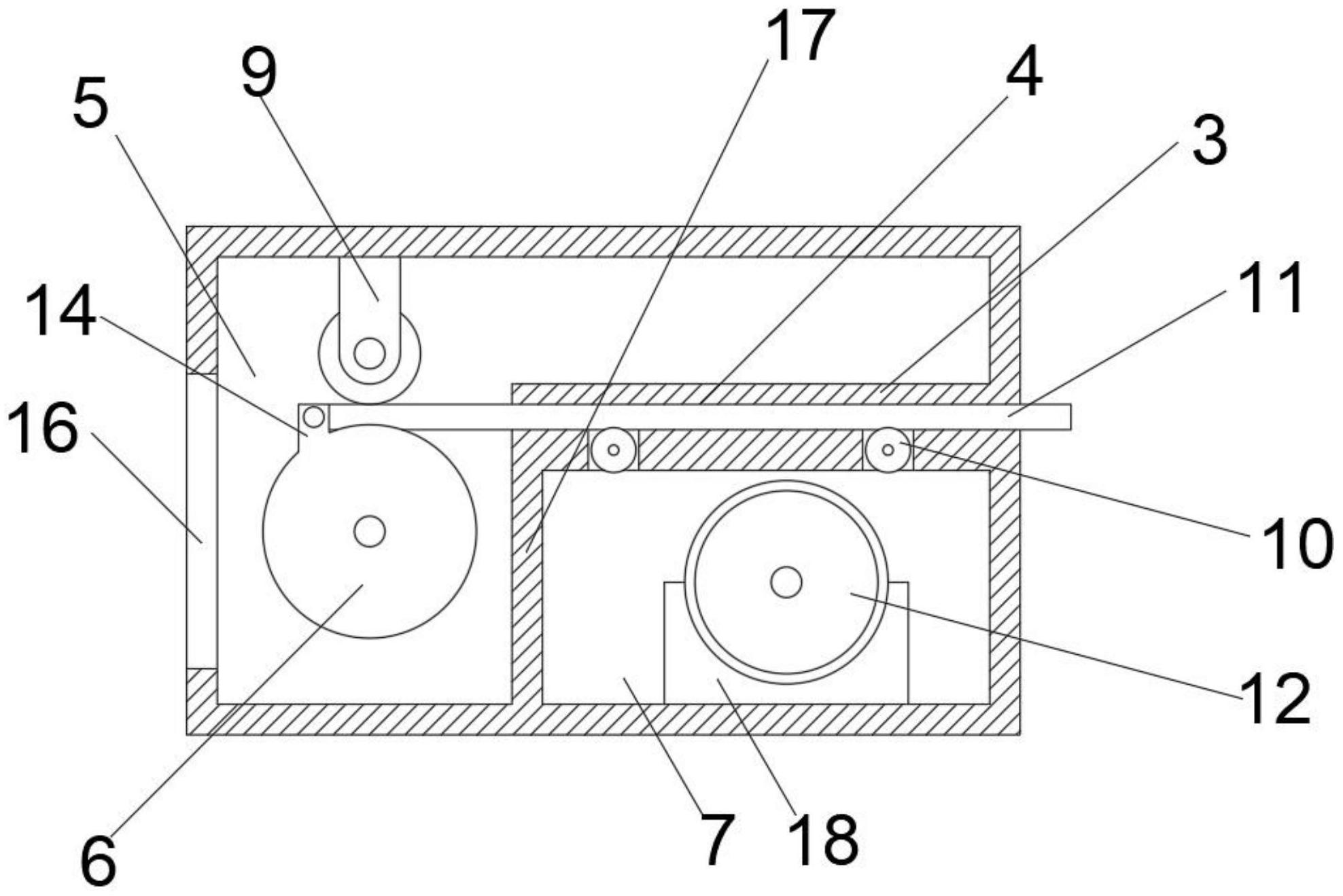 本实用新型公开了一种铜门生产用折弯装置,包括装置壳体、控制面板以及成型盘;所述控制面板设置于装置壳体一侧,装置壳体内部一侧设置有导向座,且导向座中央设置有导向槽;所述导向座下方安装有呈L型结构的挡板,通过导向座与挡板将装置壳体内部分隔形成折弯腔以及用于安装传动装置的传动腔;所述成型盘铰接于折弯腔内,并通过传动腔内的传动装置驱动;所述成型盘上端与导向槽平齐。本实用新型将铜门插入导向槽后,便可直接带动成型盘转动,进而对铜门进行折弯,无需在在折弯时需要多次挤压折弯成型。