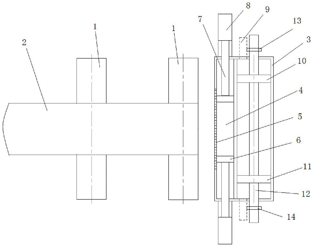 本实用新型公开一种涂胶机喷头结构,喷头靠近覆膜侧为储液腔,储液腔的侧板设置喷口,储液腔的上方设置进液口,所述进液口与输液泵连接;所述储液腔垂直于覆膜的两端设置宽度调整板,所述宽度调整板与气缸的活塞杆连接,所述宽度调整板的外廓与储液腔的内壁抵接;气缸设置在储液腔的外侧壳体上;所述喷头还设置横向位移装置,所述横向位移装置包括设置在喷头上的一对丝母座,所述丝母座的螺孔旋转方向相反,丝杠穿过所述一对丝母座,丝杠的一端设置从动齿轮,从动齿轮与电机的输出轴上的主动轮啮合。本实用新型的优点是:可通过控制中心控制喷口的宽度;保证喷口对准覆膜位置,因此,适用不同宽度及位置的覆膜,适应不同规格的覆膜的喷胶要求。
