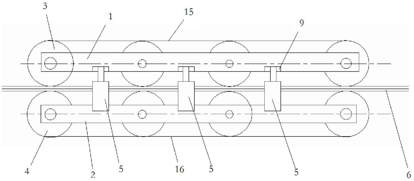 本实用新型公开一种压紧间隙可调的牵引机,包括上压框、下压框,所述上压框及下压框内均设置齿轮,上履带绕上压框内的各齿轮旋转,下履带绕下压框内的各齿轮旋转;上压框内的齿轮与下压框内的齿轮数量一致且一一对应形成一组齿轮对;两个齿轮对之间设置液压缸,液压缸固定在下压框上,液压缸的活塞设置在上压框上;履带外侧设置多组压紧块,所述压紧块与坯料接触的一侧设置柔性垫;每个液压缸与一个液压阀连接,液压阀均与控制中心连接。本实用新型的优点是:由于增加了可分别调整压力的多个液压缸,克服了履带中间位置的毛坯两侧压力不够所发生的打滑现象,保证了切割尺寸精度。