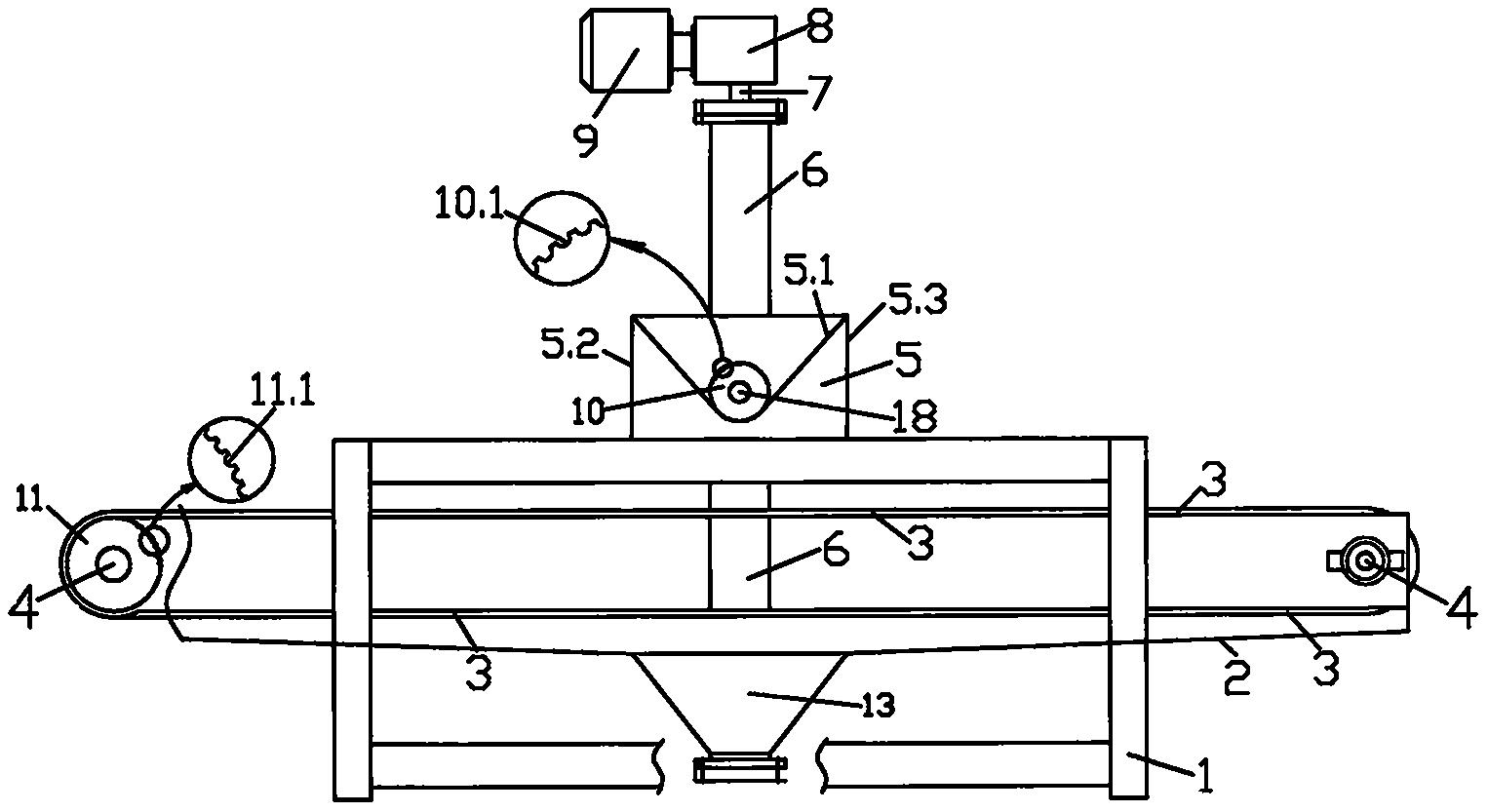本实用新型公开了一种油炸麻花面包生坯粘糠装置,包括机架,机架上面中间位置设置有糠斗,糠斗内设置有导糠板,导糠板上端与糠斗左右侧板上端固接、前后端与糠斗前后侧板固接、下端滚动摩擦连接排糠辊,排糠辊外圆面设置排糠槽,排糠辊固接排糠轴,排糠轴与糠斗的前、后侧板转动连接,排糠轴与排糠减速箱传动连接,排糠减速箱与排糠电动机传动连接;糠斗下方的机架的两端转动连接传动轴,传动轴上固接传动辊,两个传动辊之间撑紧传动连接乙字型输送带,传动辊外圆面设置有与乙字型输送带相匹配的传动槽,一根传动轴与传动减速箱传动连接,传动减速箱与传动电动机传动连接。其结构简单,劳动强度小,生产效率高。