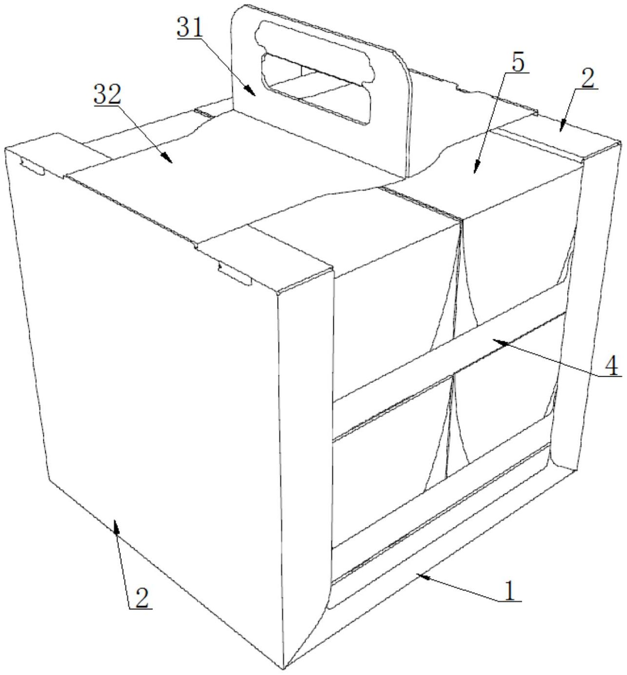 本实用新型适用于包装盒领域,提供一种包装外盒及包装盒套装,所述包装外盒包装外盒包括底盒体以及左右侧盒体,两个侧盒体的底部与底盒体的对应侧边可翻转连接,两个侧盒体的顶部通过提手组件连接,所述包装外盒的前后面至少一面形成镂空结构。消费者打开包装外盒后,可以完全露出内部的产品,有利于提高拆装包装盒的交互新鲜感,也有利于消费者快速取出产品;另外,包装外盒的前后面至少一面形成大面积的镂空结构,这样有利于全面展现出内部的产品,消费者也可以直接用手触摸产品,提高产品的展示效果;最后本包装外盒结构新颖,与现有包装外盒结构有很大差异,亦可吸引消费者,提高产品销售。