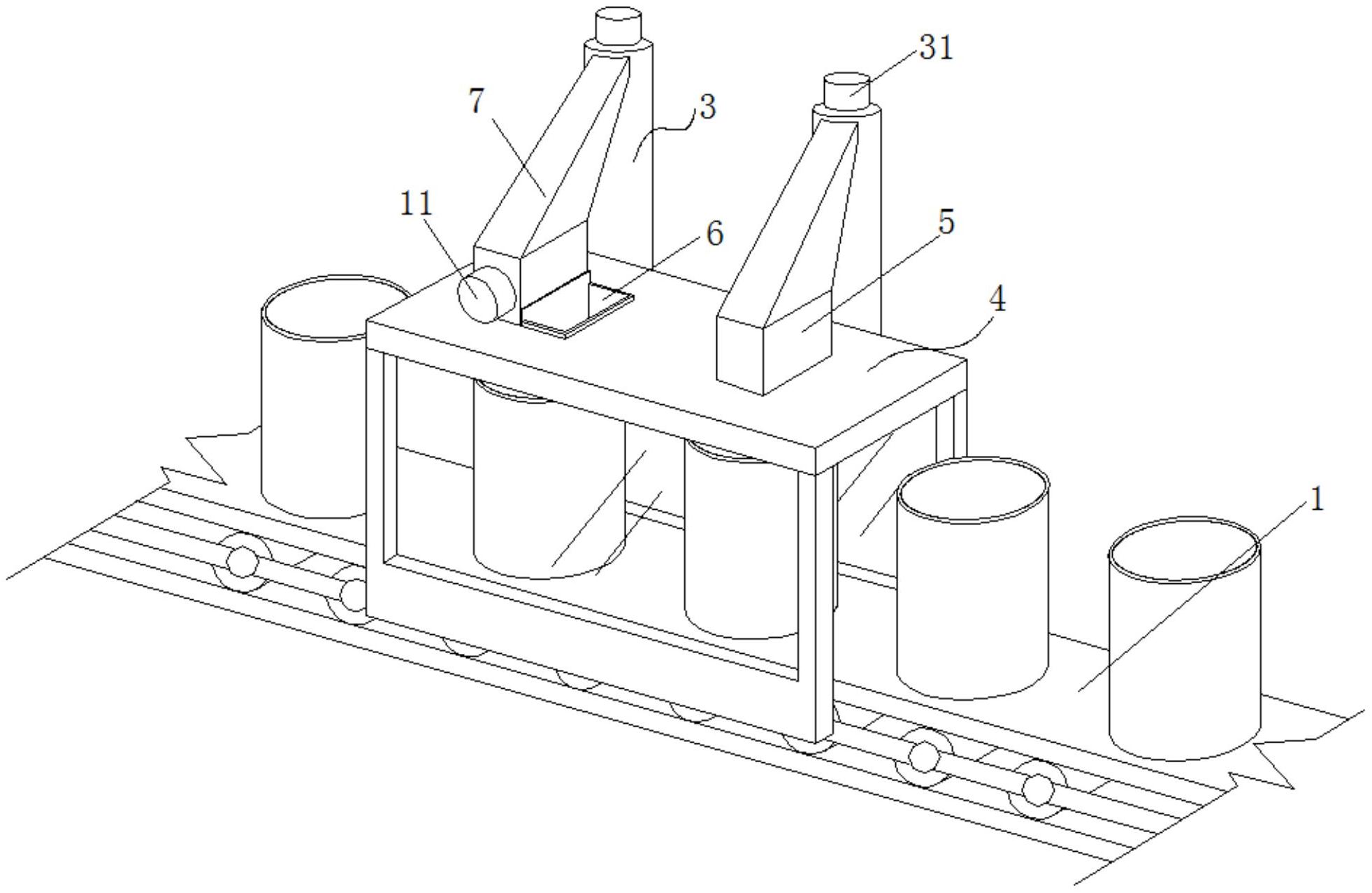 本实用新型提供了一种护色机用料桶自动加糖机构,涉及护色机技术领域,包括传送装置、砂糖仓和送料机,所述传送装置上固定架设有操作平台,所述操作平台上方分别设有两个入糖口和一个入料口,其中一个入糖口与入料口相邻,所述送料机设有两个,所述送料机的输出口设有出料通道,所述出料通道分别与对应入糖口连通。本实用新型通过两组送料机进行加糖操作,有效地提高了工作效率,在优选结构中,通过设置控量辊和自动翻转称量板,可使砂糖按比例准确加至至料桶内,实现分次自动加糖的效果,有效的节省了工作人员自动加糖的劳动力,同时保证了加糖比例的准确性。