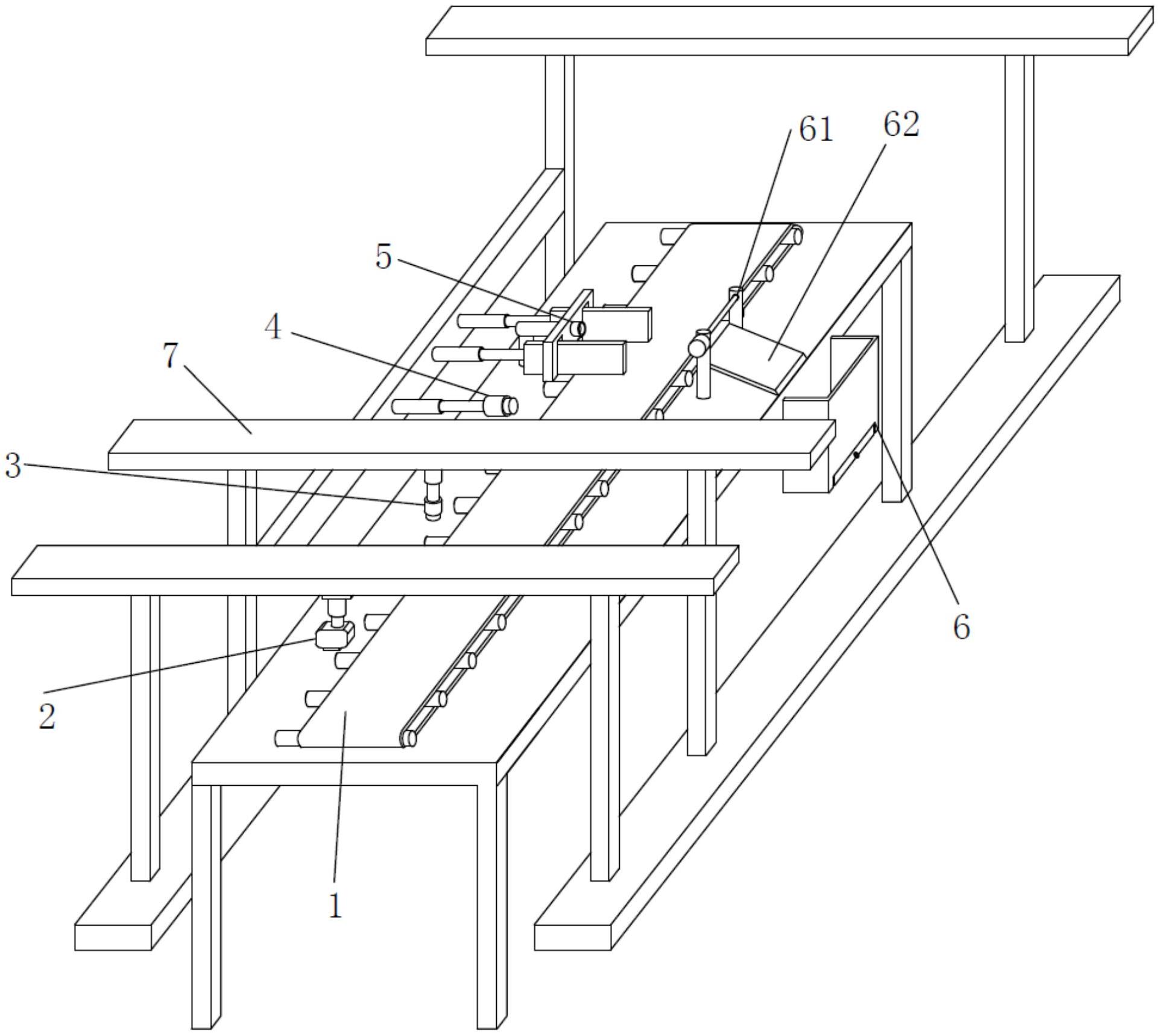 本实用新型提供了一种自动检测识别包装袋喷码、漏码的设备,涉及包装袋生产检测技术领域,包括包括输送带,所述输送带上游位置设有喷码机,所述输送带中游位置设有竖直检测相机和水平检测相机,所述输送带下游位置设有吹气组件,其中所述竖直检测相机垂直正对输送带顶面设置,所述水平检测相机和吹气组件均朝向输送带侧边设置。本装置能够准确检测残次品包装袋,并保证残次品包装袋平稳被吹落进次品收集箱,以此提高检测设备的检测筛选作业的准确率。