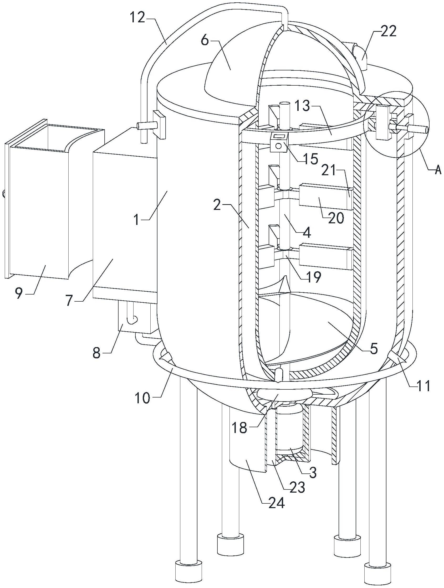 本实用新型涉及小麦制粉技术领域,提出了一种小麦制粉用打麸装置,其打麸过程中便于将麸皮从筛桶内抽出,提高了打麸效率,实用性较高,包括打麸罐,打麸罐的底部开设有多个排料口,打麸罐的内部安装有筛桶,打麸罐上安装有电机,电机的输出轴安装有搅拌杆,搅拌杆贯穿打麸罐和筛桶并伸至筛桶内部,搅拌杆上安装有输送螺带和多个搅拌组,打麸罐上通过固定机构安装有盖板,打麸罐上安装有过滤箱和抽风机,过滤箱上安装有过滤斗,抽风机的输入端与过滤箱连通,抽风机的输出端连通有送风环管,送风环管通过多个送风支管与打麸罐连通,盖板通过伸缩软管与过滤箱连通。