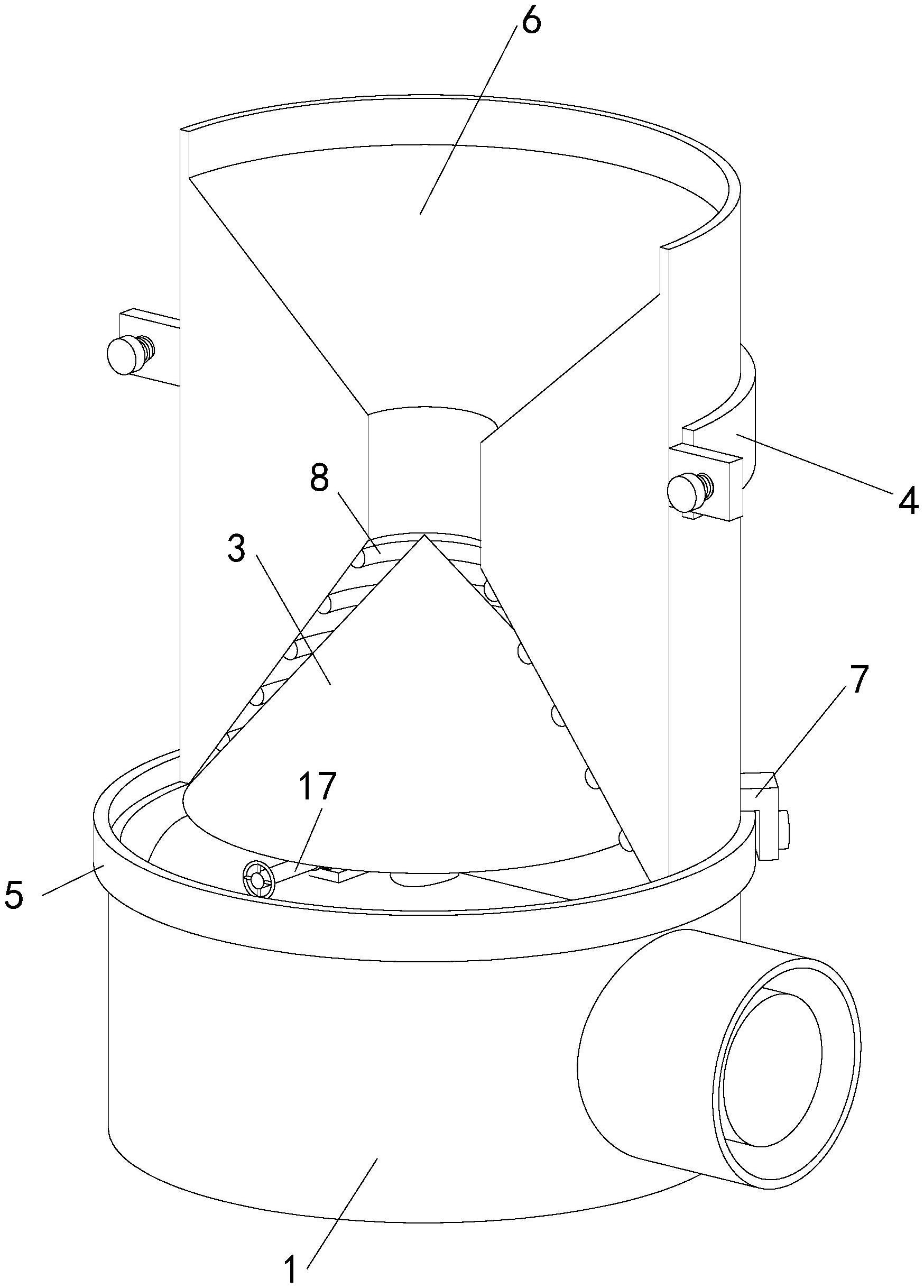 本实用新型涉及磨粉机技术领域,提出了一种小麦制粉用磨粉机的研磨装置,其便于对锥形破碎辊和凸起进行快速更换,包括磨粉机本体,磨粉机本体设有一级研磨机构,一级研磨机构设有第一圆筒、转轴和锥形破碎辊,还包括两个锁紧环,两个锁紧环之间通过锁紧螺栓连接,第一圆筒连接有安装环,安装环的内部滑动安装有两个安装壳,两个安装壳位于两个锁紧环之间,安装壳连接有多个连接架,连接架通过连接螺栓和安装环连接,安装壳开设有原料室和研磨室,研磨室的内部通过更换组件连接有多个凸起,转轴通过安装板连接有多个限位杆,锥形破碎辊位于转轴的顶端,锥形破碎辊上开设有多个和限位杆匹配的限位孔,安装板上连接有锁紧组件。