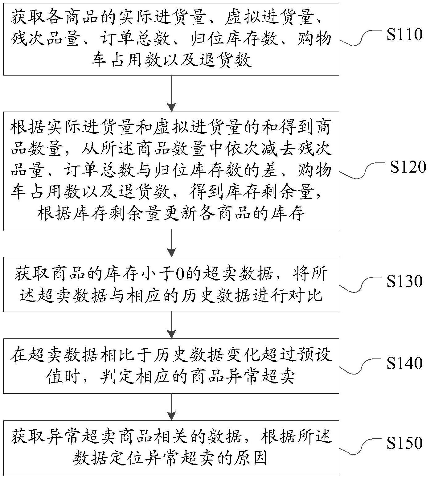 一种电子商务网站超卖原因定位的方法及装置,所述方法包括步骤:获取各商品的实际进货量、虚拟进货量、残次品量、订单总数、归位库存数、购物车占用数以及退货数;根据实际进货量和虚拟进货量的和得到商品数量,从商品数量中依次减去残次品量、订单总数与归位库存数的差、购物车占用数以及退货数,得到库存剩余量,根据库存剩余量更新各商品的库存;获取商品的库存小于0的超卖数据,将超卖数据与相应的历史数据进行对比;在超卖数据相比于历史数据变化超过预设值时,判定相应的商品异常超卖;获取异常超卖商品相关的数据,根据数据定位异常超卖的原因。本发明可以准确定位超卖原因,从而有针对性地对相应系统进行优化,从根本上解决超卖问题。