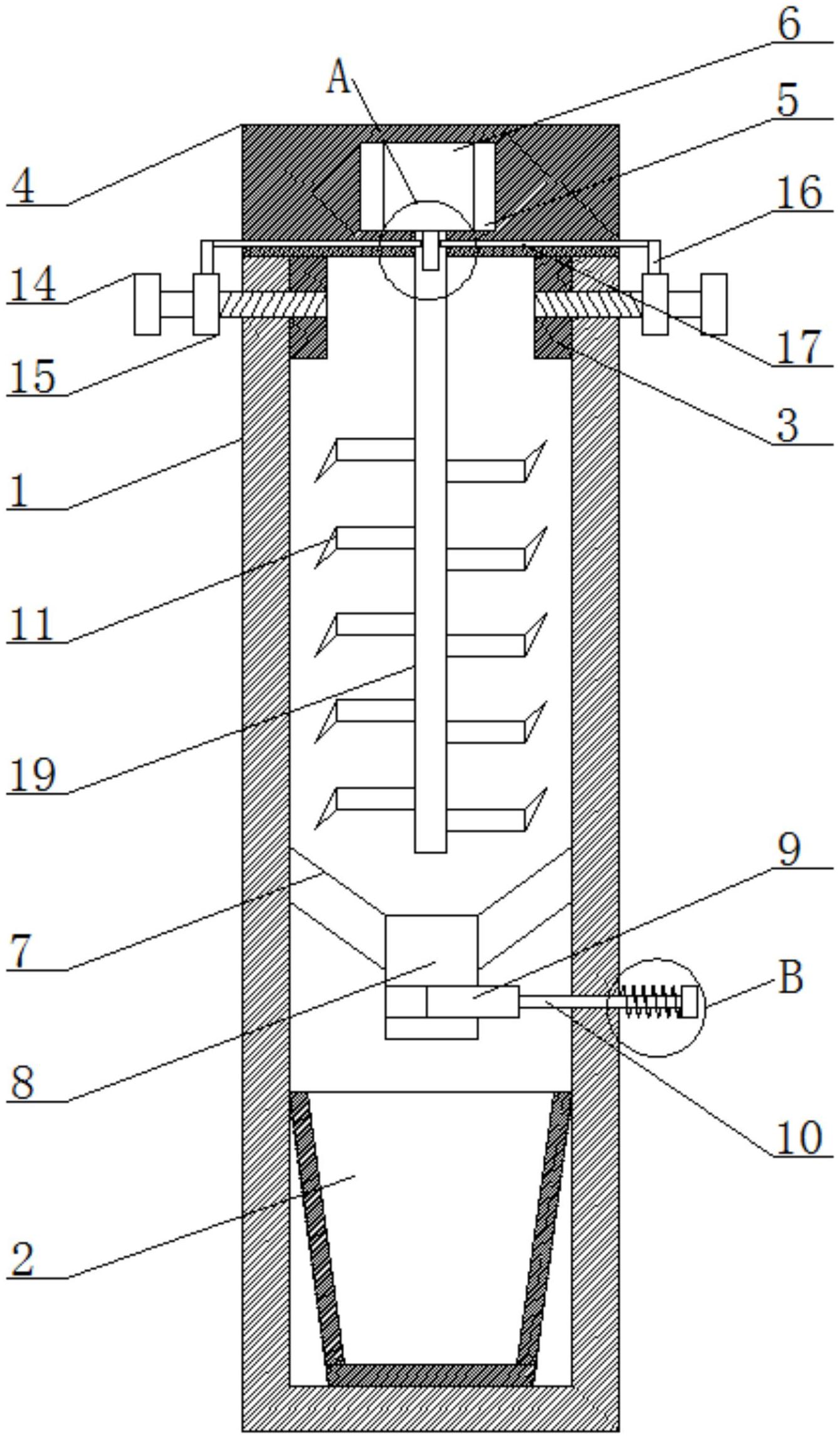本实用新型属于食品安全检测技术领域,尤其是一种食品安全检测用取样装置,针对现有的抽样装置不便于进行拆卸清洗消毒,从而降低检测的准确性的问题,现提出如下方案,其包括壳体,所述壳体的底部内壁放置有取样杯,壳体内固定安装有漏斗,漏斗的底部开设有出样口,出样口上开设有第一滑槽,第一滑槽内滑动安装有密封板,壳体的一侧开设有第一通孔,第一通孔内活动安装有第一滑杆,密封板的一侧与第一滑杆的一端固定连接,第一滑杆位于壳体外的一端固定连接有第一固定块,壳体的两侧内壁上均滑动安装有第二固定块,本实用新型能够方便拆卸进行清洗消毒,提高安全检测的准确性,结构简单,使用方便。