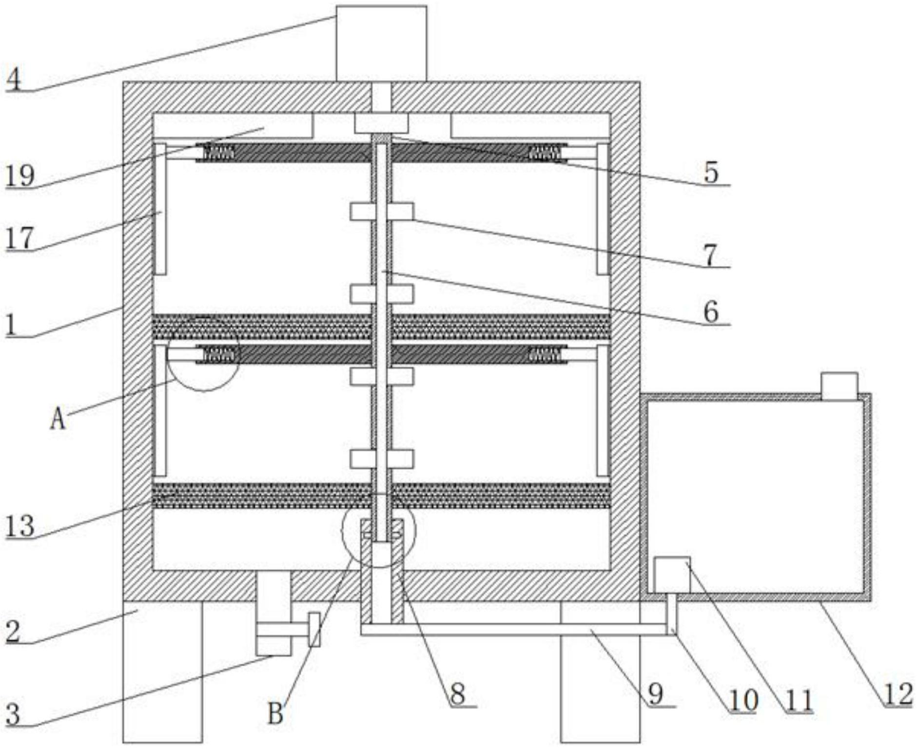 本实用新型属于食品安全检测技术领域,尤其是一种食品安全检测用消毒装置,针对现有的在消毒过程中消毒液喷洒不均匀且不便于清洁,从而导致消毒不够彻底问题,现提出如下方案,其包括壳体,所述壳体的底部固定安装有对称的两个支撑柱,壳体的底部开设有出水口,壳体的顶部固定安装有电机,壳体的顶部开设有第一通孔,第一通孔内转动安装有转杆,转杆的底部开设有第二通孔,第二通孔内固定安装有第一连接管,壳体内固定安装有两个镂空板,两个镂空板上均开设有安装孔,两个安装孔的内壁均与转杆的外侧滑动连接,本实用新型能够在消毒过程中使消毒液喷洒均匀且便于清洁,提高消毒效率,结构简单,使用方便。