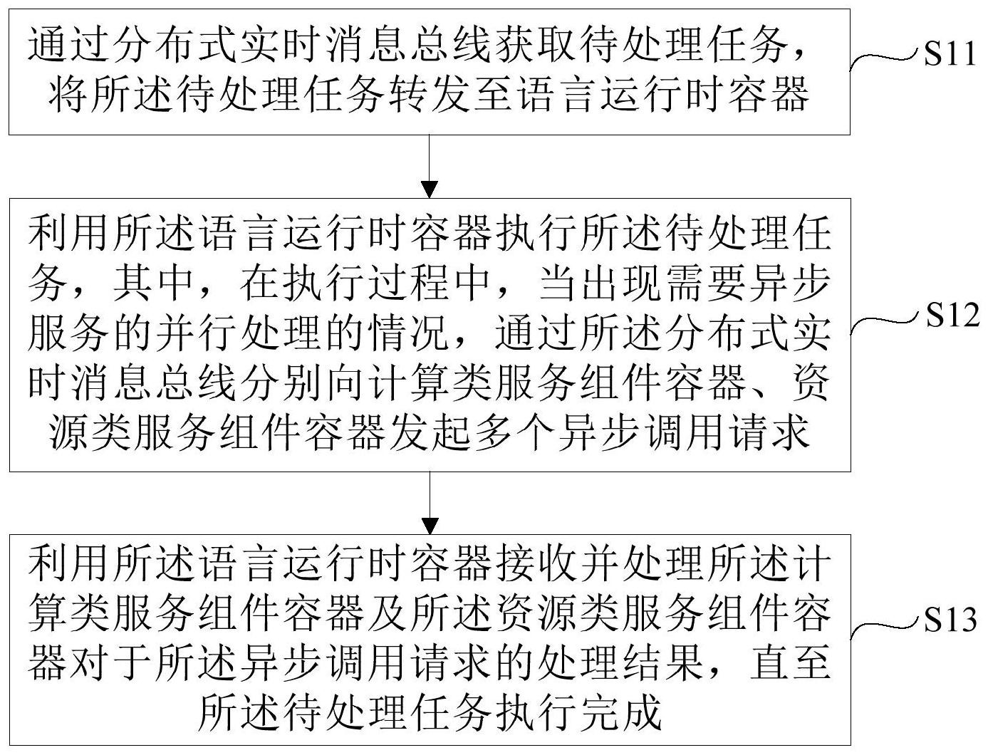 本申请的目的是提供一种分布式任务处理方法与设备。与现有技术相比,本申请通过分布式实时消息总线获取待处理任务,将所述待处理任务转发至语言运行时容器,利用所述语言运行时容器执行所述待处理任务,其中,在执行过程中,当出现异步服务的并行处理的情况,通过所述分布式实时消息总线分别向计算类服务组件容器、资源类服务组件容器发起多个异步调用请求,接着,利用所述语言运行时容器接收并处理所述计算类服务组件容器及所述资源类服务组件容器对于所述异步调用请求的处理结果,直至所述待处理任务执行完成,从而提升系统的业务处理能力,减少移动互联场景复杂业务逻辑的处理时间,做到低延时响应。