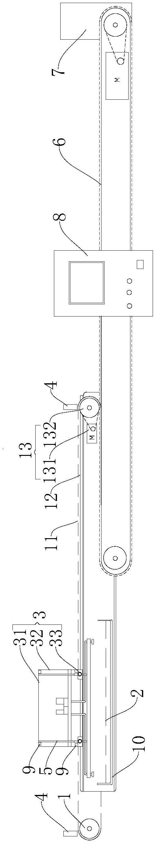 本实用新型提供了一种白板托盘供栈装置,属于挂面生产加工技术领域,包括牵引机构、升降吸附机构、输送带和控制器;牵引机构设置有两组,平行且间隔设置,两组牵引机构的一端均位于白板托盘的上方,另一端向白板托盘的外部水平延伸;两组牵引机构连接有移动架;两组或其中一组牵引机构的两端还分别设有限位开关;升降吸附机构与移动架连接,能够沿上下方向升降,并且用于吸附白板托盘;输送带的一端位于两组牵引机构的伸出端的下方,另一端向牵引机构的外侧水平延伸至码垛机;控制器分别与两组牵引机构、限位开关、升降吸附机构以及输送带电连接。本实用新型提供的白板托盘供栈装置,可提高白板托盘转移过程的工作效率并降低工作成本。
