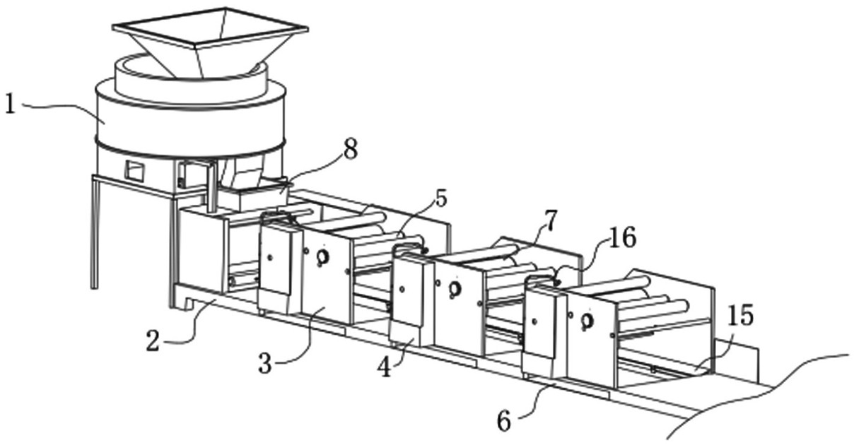 本实用新型涉及面粉加工技术领域,具体公开了一种面条多级碾压设备,包括搅拌下料机、工作台和挤压机,所述挤压机安装在工作台顶部一端,所述挤压机位于搅拌下料机下方,且所述搅拌下料机设置在工作台一侧边沿,所述工作台顶部均安装有多组碾压单元,且多组所述碾压单元均包括沿水平方向等距离安装在工作台顶部的支撑架,所述支撑架内侧转动安装有压辊,所述支撑架内侧且靠近压辊外侧下方以及后端均转动安装有多组转辊,所述压辊的一端延伸至支撑架外侧且端部安装有电机箱组件,本实用新型可充分减少面条加工过程中的杂质,使得更加光滑,其次便于在碾压时的干面粉坨进行收集并清理,使用起来尤为便利。