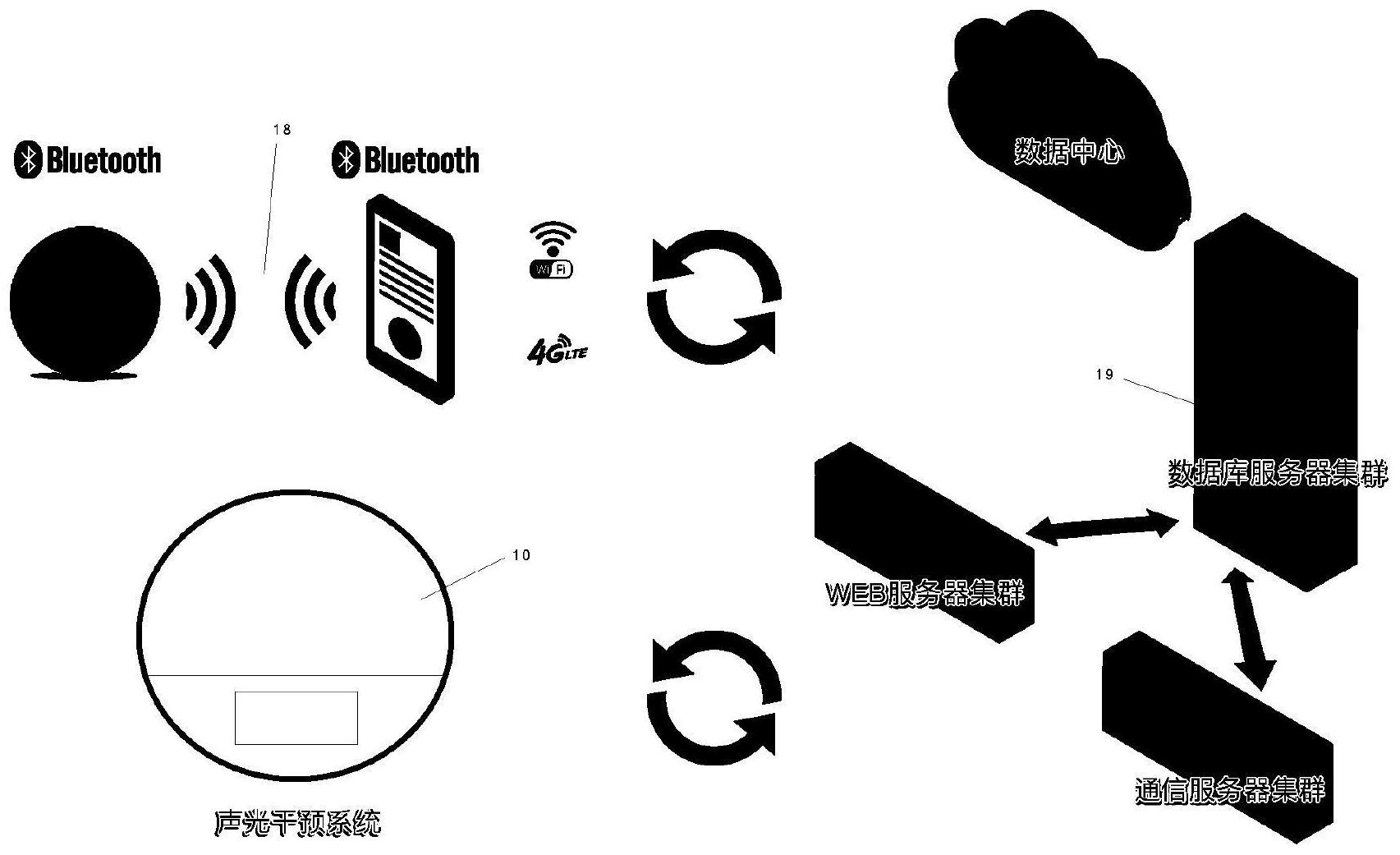 本发明公开了一种智能睡眠监测及助眠云服务系统:智能睡眠监测及助眠云服务系统由睡眠监测模块、云服务中心、声光助眠模块组成,所述睡眠监测模块包括睡眠监测磁扣和睡眠管理终端;睡眠监测磁扣具有壳体,壳体内安装有体动监测传感单元、信号采集单元、中央处理单元、数据传输单元,这些单元之间均为电连接;所述声光助眠模块包括外壳,外壳内安装有环境光传感器、中央控制模块、无线通讯模块、多色LED灯带、触摸屏、语音模块;所述环境光传感器、无线通讯模块、多色LED灯带、触摸屏、语音模块均电连接到中央控制模块。