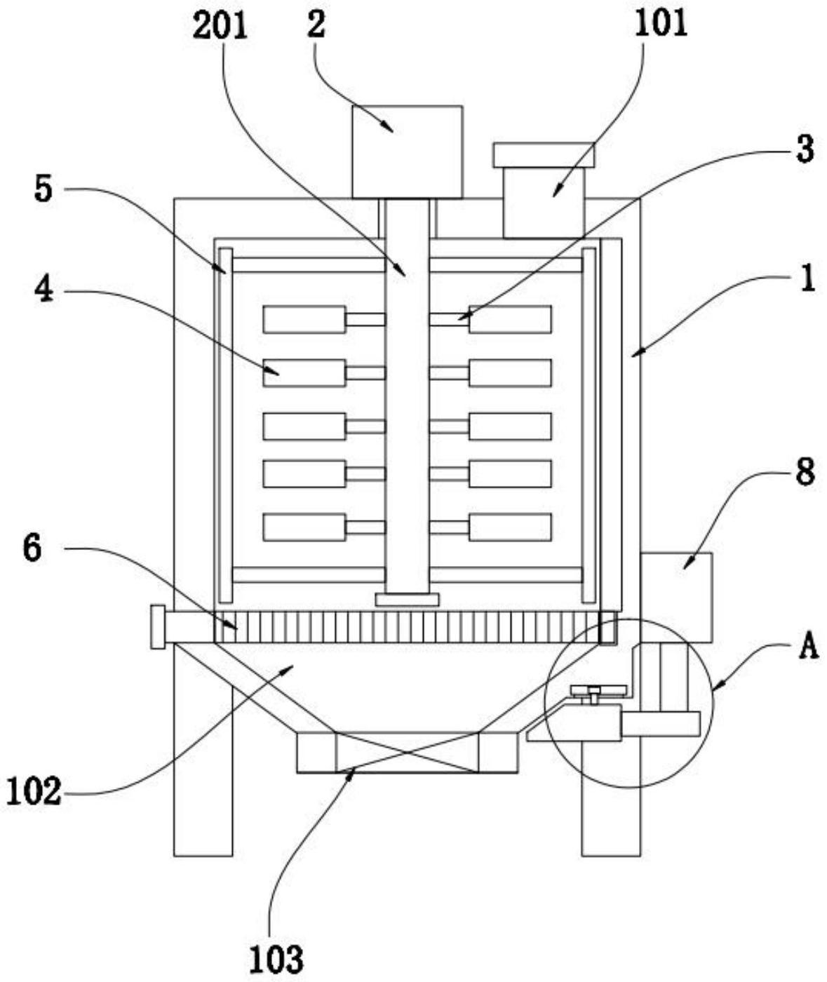 本实用新型公开了一种全自动胚体搅拌罐装一体机,包括主机体、搅拌叶、滤板和拨动块,主机体顶端的中间位置固定安装有第一旋转驱动装置,第一旋转驱动装置的底端固定连接有第一转杆,第一转杆外部的一侧固定连接有连接杆。本实用新型通过在主机体外部一侧的底端安装有第二旋转驱动装置,通过第二旋转驱动装置启动可以带动第二转杆旋转,并使第二转杆带动转动块旋转,同时转动块会推动一侧的拨动块,并使拨动块撞击灌装口的外壁,同时拨动块会通过滑杆挤压一侧的第二弹簧,并通过第二弹簧的反作用力进行复位,同时配合转动块的推动进行反复撞击运用,提高胚体灌装的下落速度。