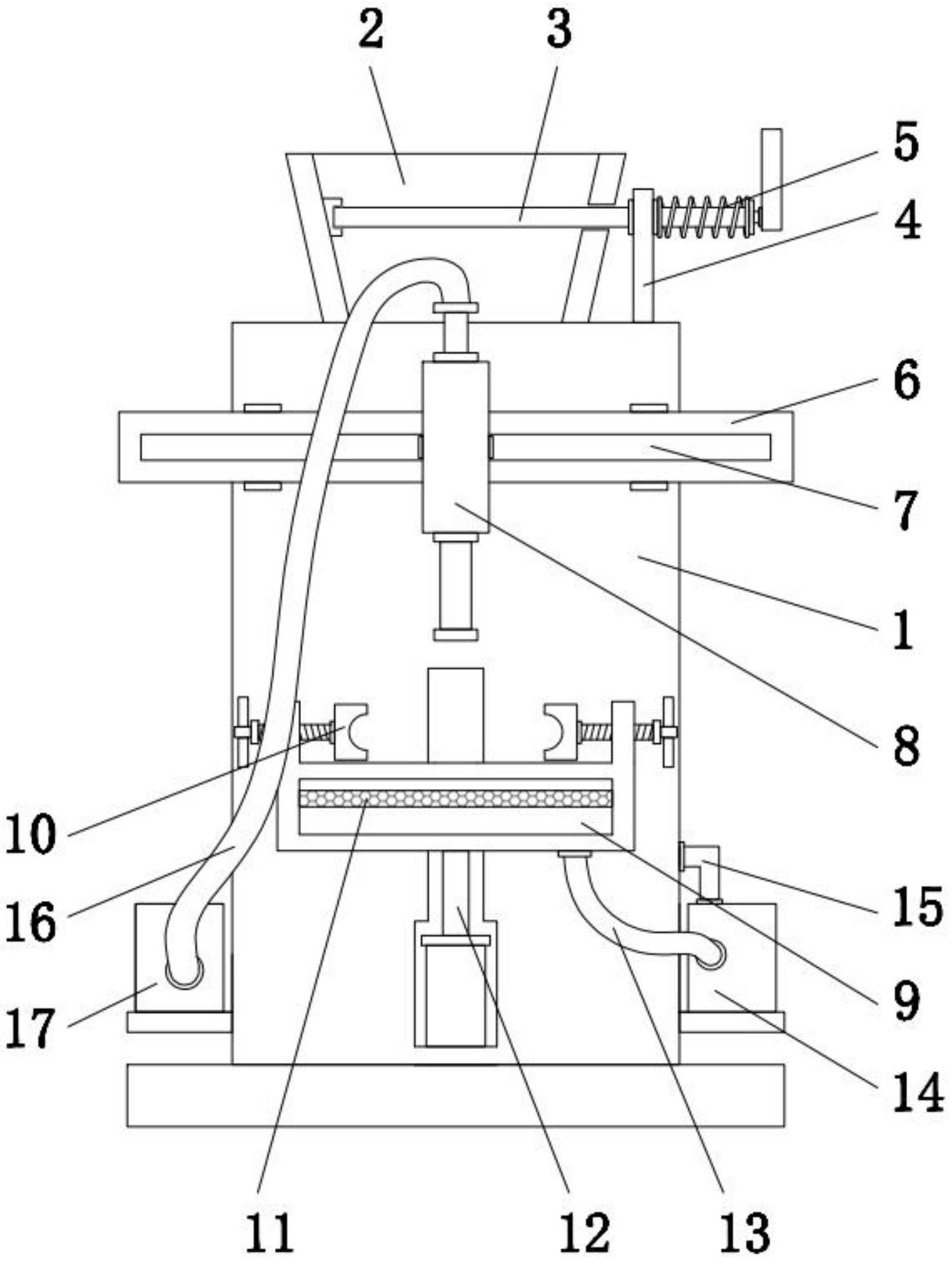 本实用新型公开了一种巧克力喷砂涡轮净化设备,包括连接板、闭合板、固定夹持件和第一水泵,连接板的顶部设置有进料斗,进料斗的内部连接设置有闭合板,进料斗外部的一侧连接设置有连接杆,连接杆的内部以及闭合板一端的外部连接设置有弹簧,连接板正面顶部的位置连接设置有行走横梁。本实用新型通过在可在连接杆的范围内向右拉动闭合板整体,可使闭合板整体随着拉力移动至进料斗一侧位置,则便于清洁物料可通过进料斗进入到储料箱内部,则闭合板也可通过弹簧的弹性回弹至进料斗内部,呈现关闭状态的进料斗可有效避免灰尘等杂物进入到连接板内部,可有效保护储料箱内部的环境。