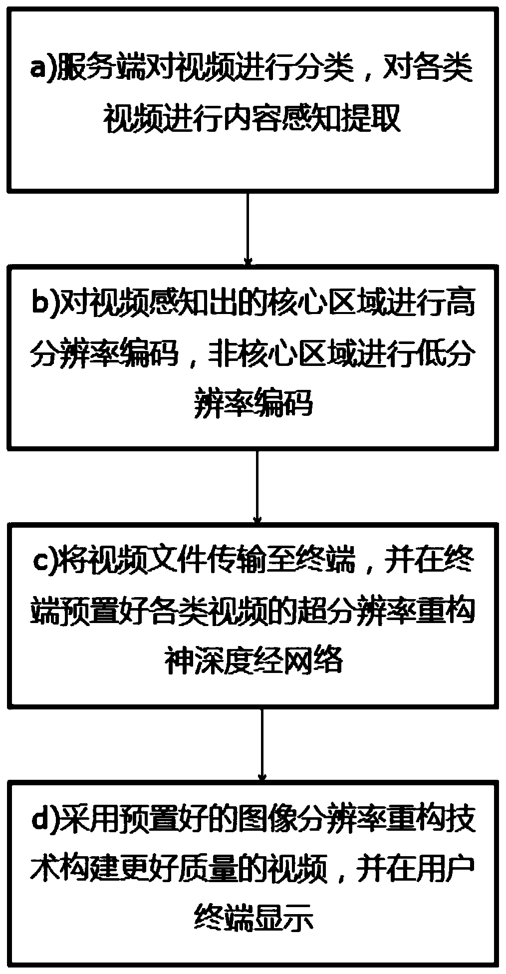 本发明为一种基于深度学习网络的内容感知视频自适应传输方法。该发明是一种新的视频传输框架,可以有效利用客户端的计算能力。可根据视频的类型,在服务端进行特定的内容感知处理,提取核心有效信息进行编码处理,在客户端,对服务器中所下载视频进行清晰度重构,从而可以对较低质量的视频经过深度学习网络的处理达到一个较好的视频质量,该方法能够有效减少视频流对带宽的依赖性并提高用户的观看体验。