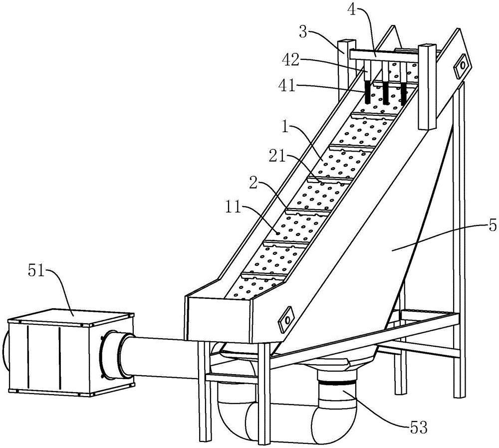 本实用新型公开了一种原料提升装置,涉及物料运送技术领域,旨在解决现有技术中原料分筛耗费人力和泥土清理不便的问题。其技术方案要点是包括传送带,所述传送带上沿传动带的输送方向间隔设置有限位板,所述传送带上均布有若干个穿孔,所述限位板与传送带靠近的侧壁上设置有多个贯穿限位板厚度通槽。本实用新型达到了能够分筛原料和清理泥土的效果。