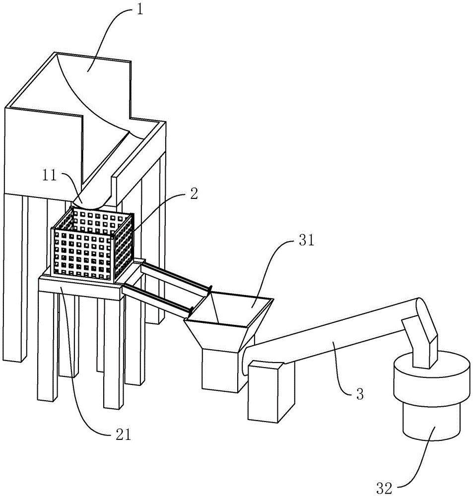 本实用新型公开了一种冷漂机收渣装置,涉及薯片加工设备技术领域,旨在解决若薯渣得不到合理的利用,不仅造成资源浪费还造成环境污染的问题。其技术方案要点是,包括位于冷漂机下方的出料箱,出料箱底面设置有伸出出料箱侧壁的引流板,还包括设置在引流板下方的收集箱、用于承载收集箱的底座以及卧式螺旋沉降离心机;收集箱包括筛网框以及连接在筛网框内的筛网,筛网框包括位于收集箱宽度方向的第一筛网框以及位于收集箱长度方向的第二筛网框,第一筛网框可拆卸连接于两个第二筛网框之间。湿薯渣从出料箱沿着引流板流入收集箱中,再将薯渣送入卧式螺旋沉降离心机,对薯渣进一步脱水方便贮存运输,达到方便回收利用薯渣的目的。