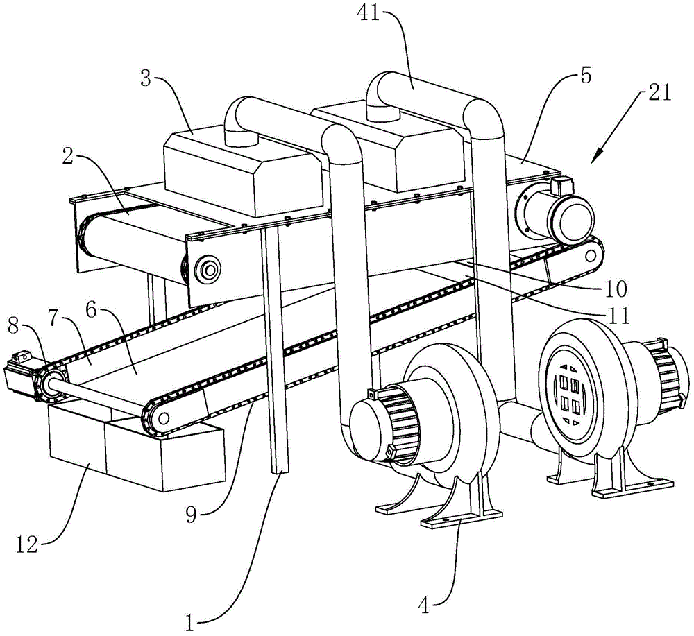 本实用新型公开了一种切片食材沥水装置,属于沥水设备领域,其包括机架,所述机架上设置有由驱动装置驱使传动的沥水网链,所述机架上位于沥水网链的上方设置有吹风罩,所述吹风罩连接有引风装置。本实用新型具有可对食材表面进行风干,以提高其沥水效果,且不占用过多的安装空间的优势。