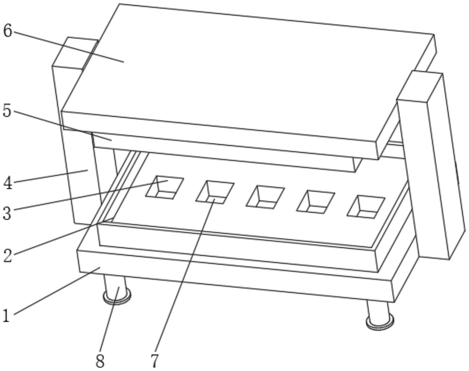 本实用新型公开了一种米饼胚体的膨化装置,包括固定座,所述固定座的顶部固定连接有模具盒,所述模具盒的内腔开设有模具槽,所述固定座的两侧均固定连接有承载座,所述承载座内腔的顶部固定连接有气缸,所述气缸的底部固定连接有支撑杆,所述支撑杆的一侧贯穿至承载座的外部固定连接有固定板。本实用新型首先使用者将原料放进模具槽的内腔,落在推动板的表面,然后使用者通过外置控制器将气缸启动,通过气缸推动支撑杆移动,通过支撑杆带动固定板移动,通过固定板推动加热器移动,通过加热器移动卡接在模具槽的表面,然后使用者通过外置控制器将加热器启动,通过加热器产生热量对米饼原料进行加工。