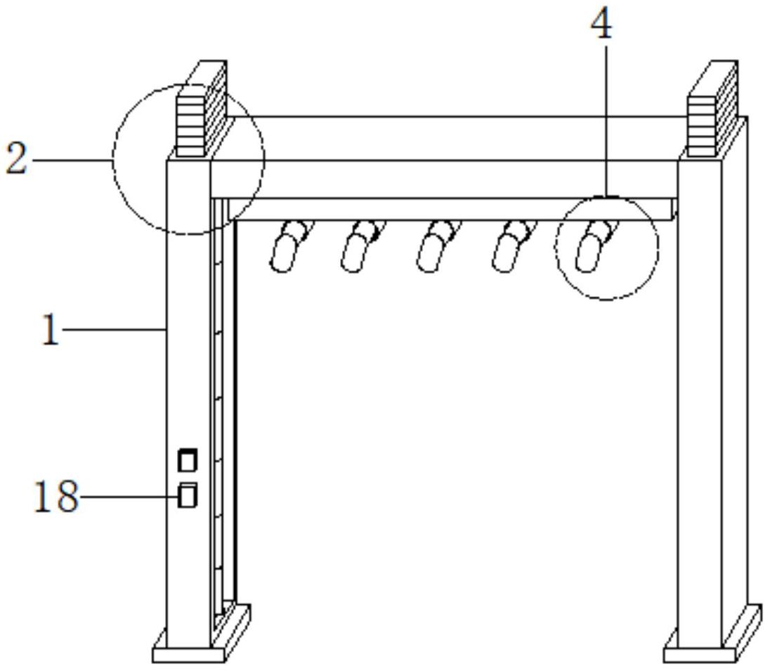本实用新型涉及环保除尘技术领域,具体公开了一种火电厂输煤皮带喷雾除尘装置。该装置包括安装框架,安装框架内通过升调机构连接有制动式衔接机构,升调机构对称设置于安装框架内腔两侧,且制动式衔接机构设置于相邻的两个升调机构之间,制动式衔接机构底面设置有喷淋机构,制动式衔接机构顶面卡合连接有衔入机构,且衔入机构设置于安装框架内腔顶面。本实用新型采用调速电机作为输出的中枢,以及通过丝杆作为制动的部件,并通过螺纹作为带动的方式,有效带动喷淋端进行上下位移,使得在维修时,不需要工作人员通过梯子攀爬至高处进行更换,提高了更换的效率,降低了危险系数。