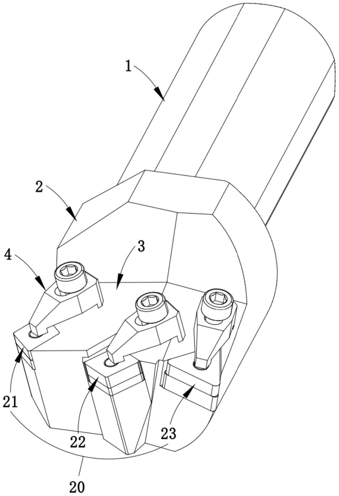 本实用新型涉及机床刀具技术领域,具体涉及一种三头组合刀具。包括刀体、刀头、刀片安装组件以及刀片。所述刀头设置于所述刀体的一端,所述刀片安装组件设置于所述刀头上,三个所述刀片分别沿不同方向凸出于所述刀头端部轴向和端部两侧径向的表面、并被三个所述刀片安装组件固定于所述刀头上。本实用新型的三头组合刀具通过安装在所述刀头端部径向侧面的车外圆刀先切削加工工件的外圆部分,切削完成后提起刀具,再利用刀头端部轴向的车平面刀切削加工工件的平面部分,最后再通过刀头端部径向侧面的车内圆刀切削完成工件的内腔部分的加工,继而避免了加工过程中的换刀操作,从而提高了加工效率。