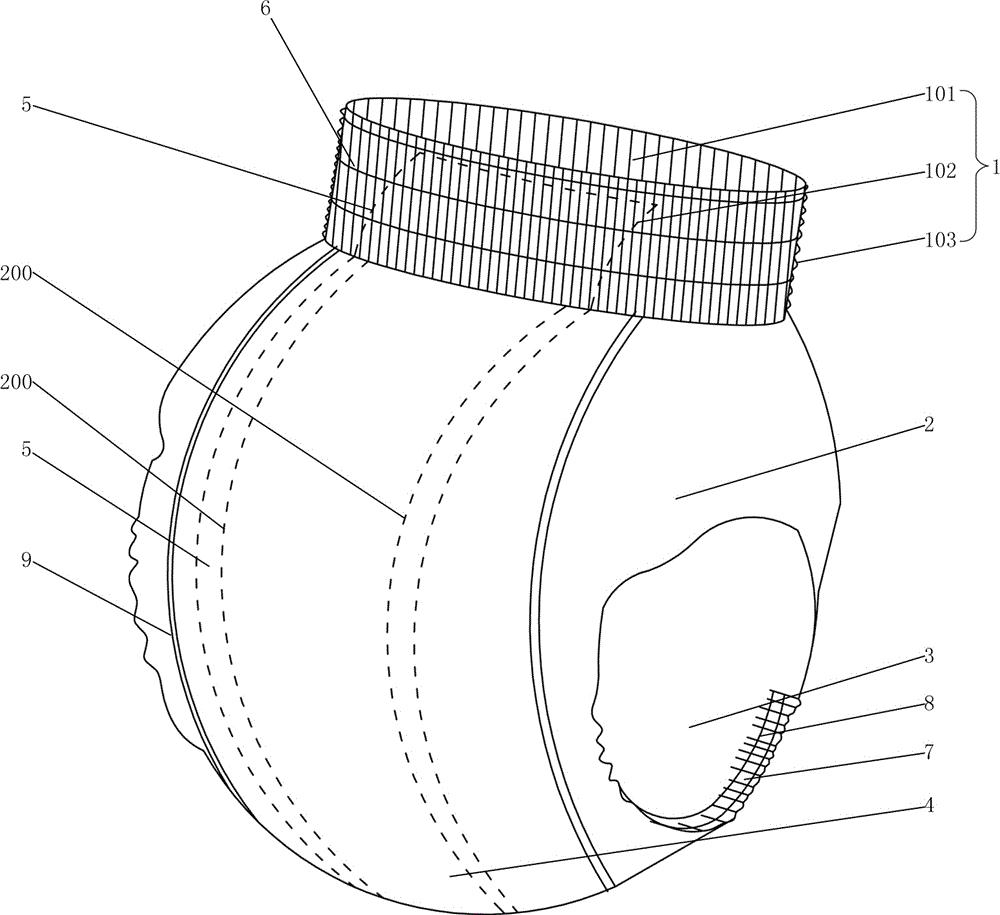一种穿着更舒服的拉拉裤,包括环形弹性腰部和裤裆部,裤裆部的两端分别连接在环形弹性腰部的下边缘;环形弹性腰部、裤裆部均包括亲水层和防漏层,亲水层处于防漏层的内侧;裤裆部还包括吸水芯片,吸水芯片夹置在裤裆部的亲水层与防漏层之间,吸水芯片的端部夹置在环形弹性腰部的亲水层与防漏层之间;吸水芯片的两个侧边均超出亲水层与防漏层的粘接痕;环形弹性腰部上沿着环形弹性腰部的周向设有多条由上至下相间隔的第一橡筋线;裤裆部两侧均设有立体护围,立体护围上设有多条第二橡筋线,立体护围与裤裆部的粘接位处于吸水芯片的下方。在婴幼儿穿戴的过程中,立体护围上橡筋线不会绷紧在婴幼儿大腿内侧上,使穿着更舒服,婴幼儿的活动更加方便、自由。