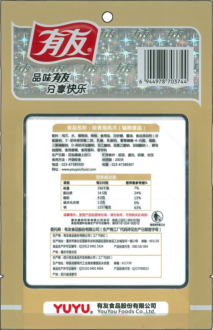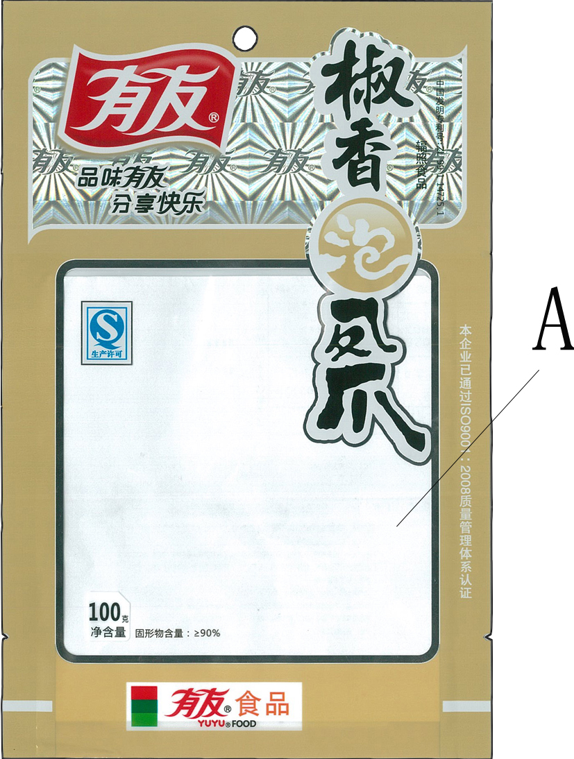 1.本外观设计产品的名称:包装袋(椒香泡凤爪)。2.本外观设计产品的用途:本外观设计产品用于包装食品。3.本外观设计产品的设计要点:产品的图案及色彩的结合。4.最能表明本外观设计设计要点的图片或照片:主视图。5.省略视图:本外观设计产品为平面产品,故省略其他视图。6.请求保护的外观设计包含色彩。7.主视图A处为透明材质。