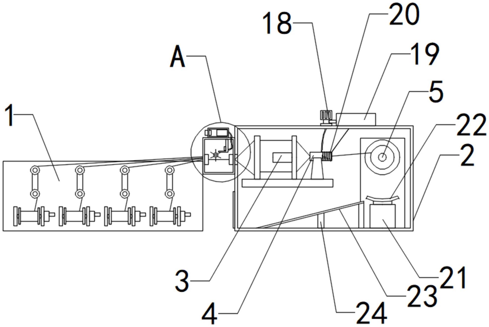 本实用新型涉及电缆生产加工的技术领域,特别是涉及一种电缆加工用绞线机,其通过理线装置使上料装置供应的金属线水平分布,便于清线装置对金属线进行清理;通过清线装置对金属线进行清理,减少金属线所携带的杂物;通过吸尘装置对清线装置清除的杂物进行收集;通过降温装置对绞线机的温度进行控制;通过辅助装置对收线盘的安拆进行辅助,降低了操作人员的劳动强度,提高了装置的实用性;包括上料装置、加工箱、放线架、绞线机和收线盘,加工箱的内部安装有放线架、绞线机和收线盘,上料装置的输出端与加工箱的输入端连接,上料装置位于加工箱的左侧,收线盘位于绞线机的右侧;还包括理线装置、清线装置、吸尘装置、降温装置和辅助装置。