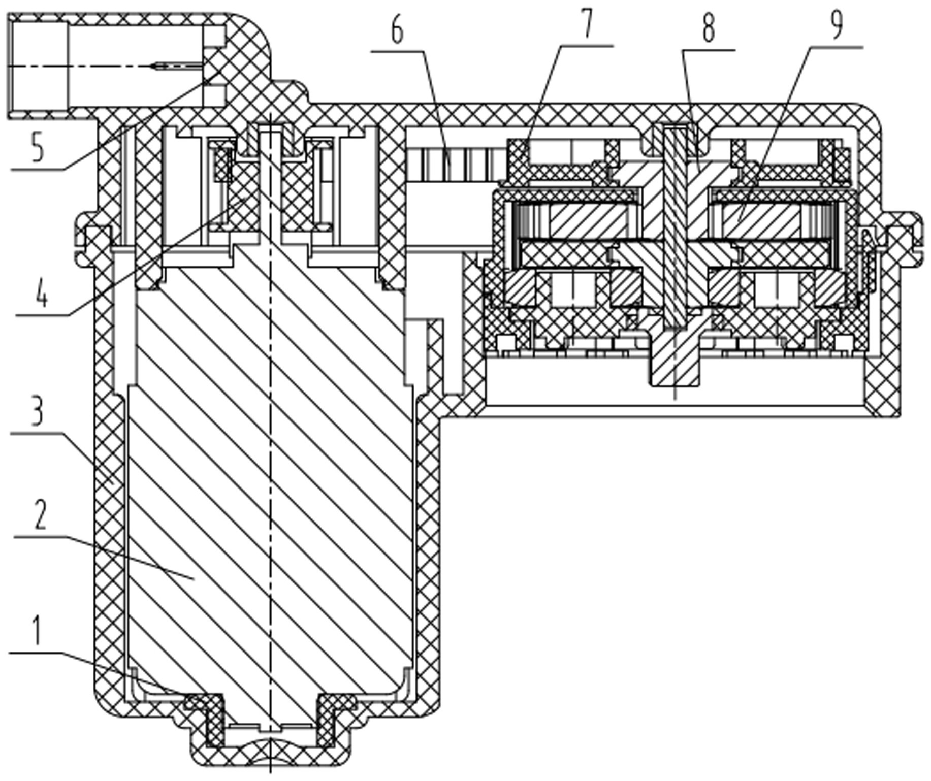 本发明涉及一种卡钳式电子驻车执行器,包括电机(2)、下壳体(3)、小皮带轮(4)、上盖(5)、皮带(6)、大皮带轮(7)、大皮带轮镶件齿轮(8)、行星齿轮传动机构(9)和小皮带轮(4),所述上盖(5)的中心截面上设有四个定位孔,上盖(5)的左右方向分别有两个定位孔(51)与下壳体(3)的左右两个定位圆柱(31)相配合,从而保证上盖(5)与下壳体(3)的电机轴孔与行星齿轮传动机构(9)的主轴孔重合;上盖(5)的中间部位两个定位圆孔(54)分别与电机轴及大皮带轮轴相配合,省去了定位板及电机固定支架。本发明的执行器大大的优化传动结构、体积小、定位准确、噪音低、工作可靠。
